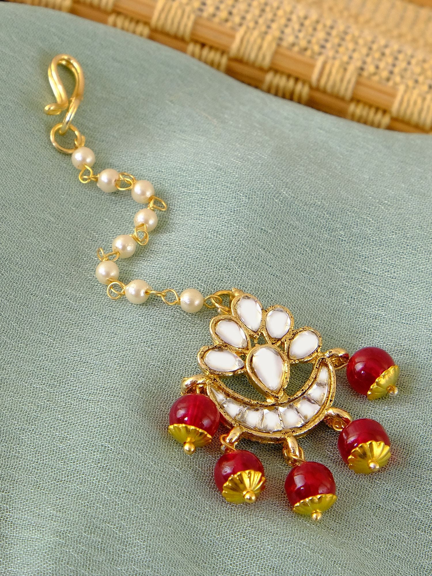 Kundan Studded Maroon Pearls Maang Tikka for Girls/Women