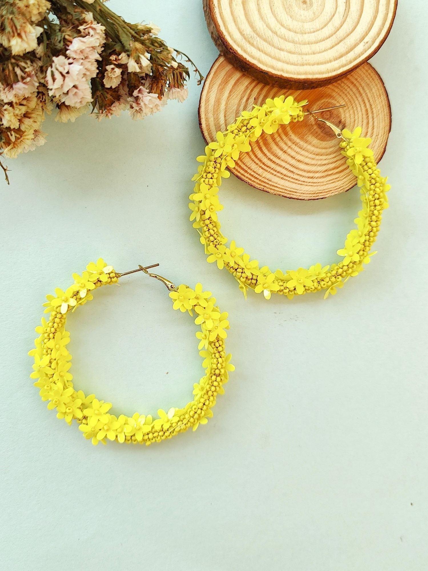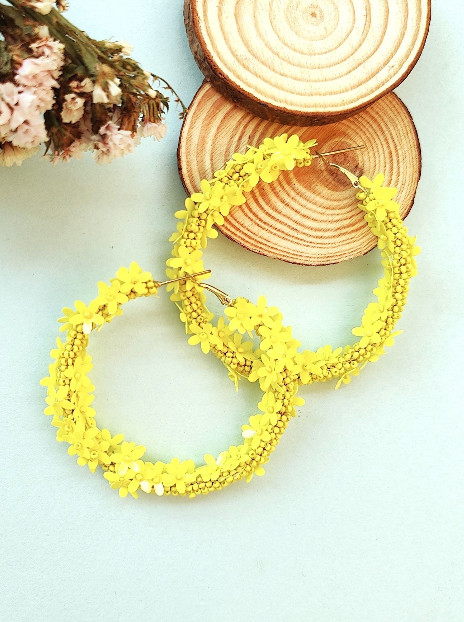 Blossoming Summer: Handmade Lime Yellow Floral Beaded Hoop Earrings