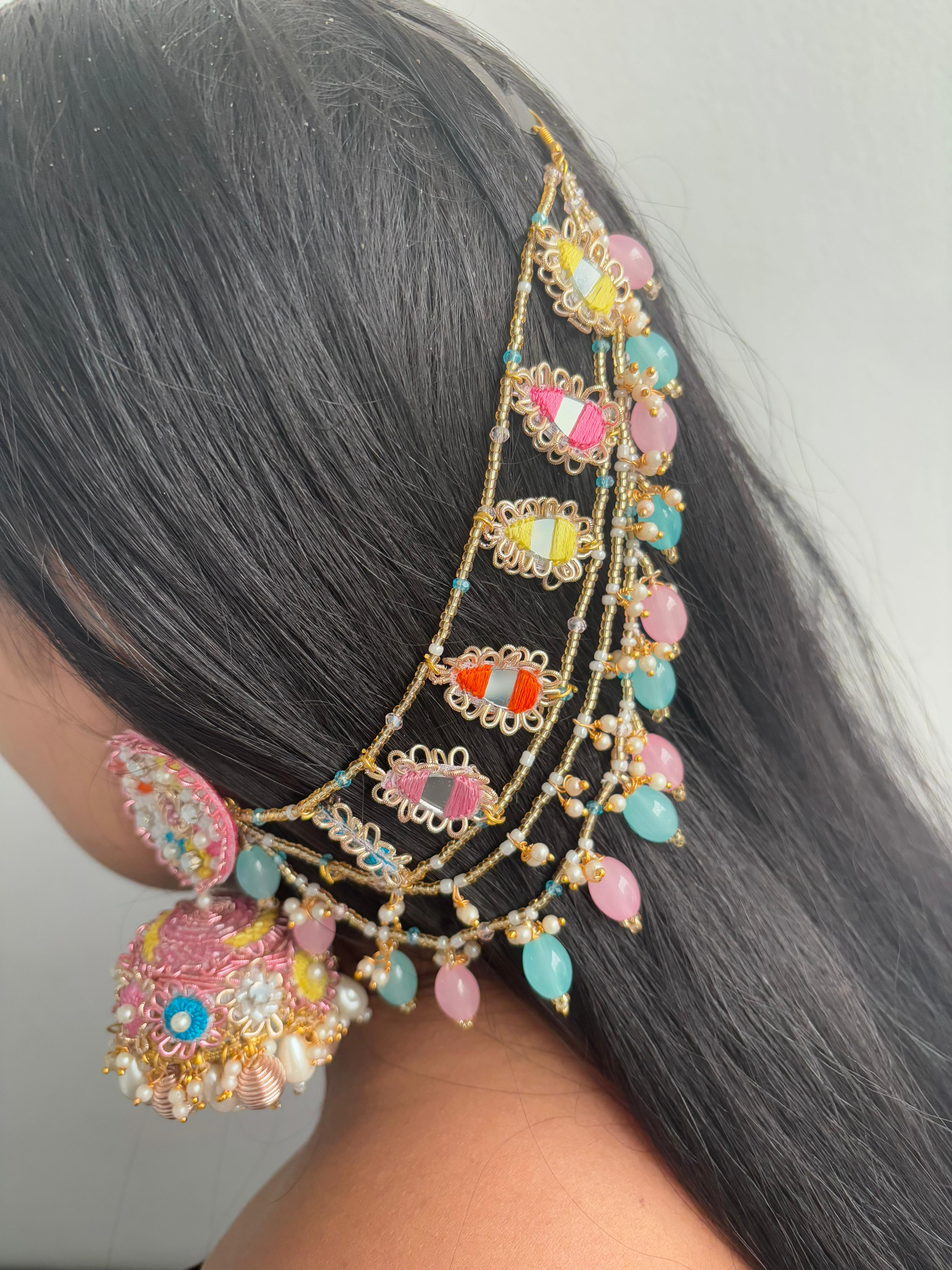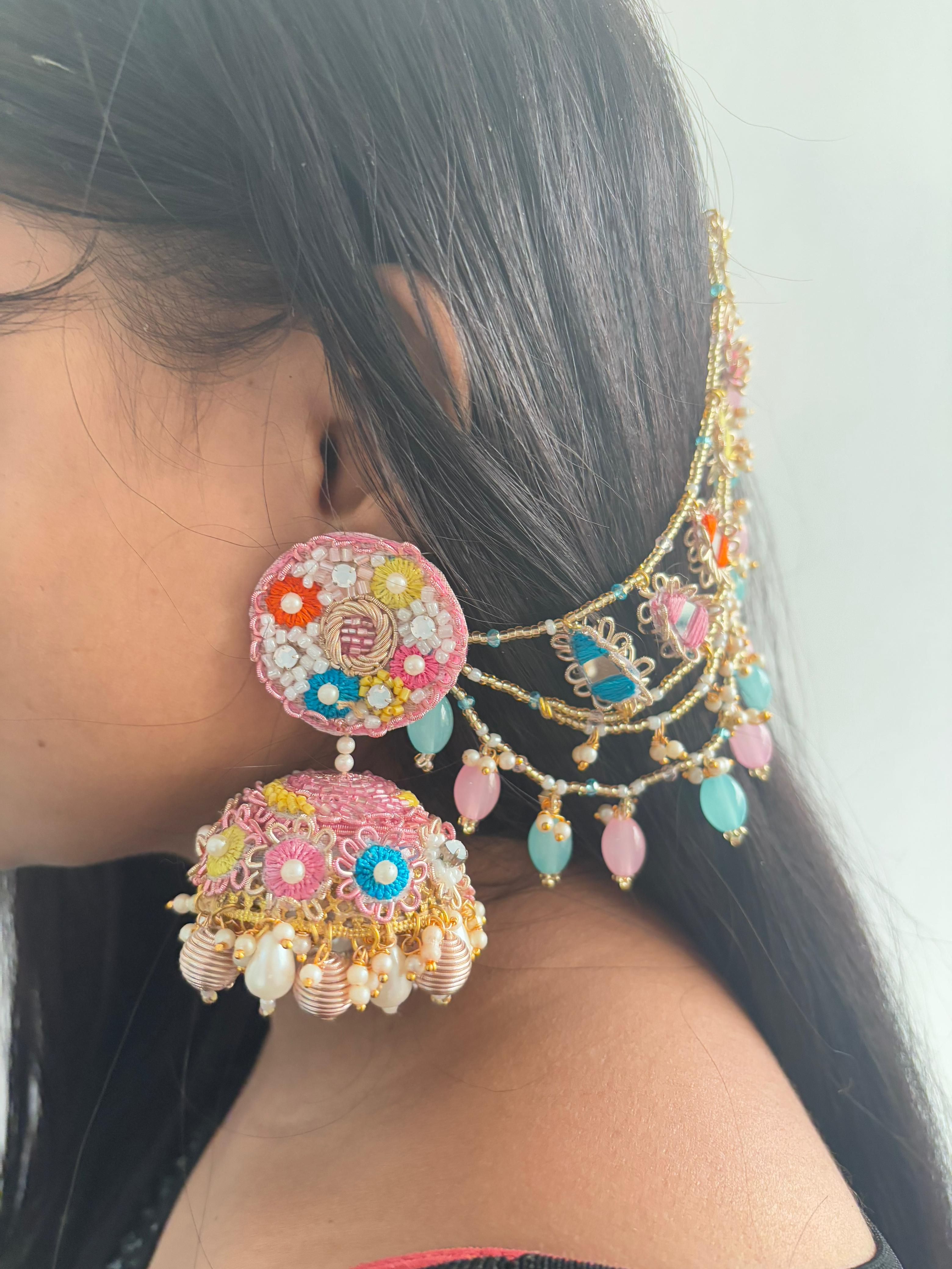 Pink-multicolored handmmade Dabka Work Jhumka and Earchain Set for Haldi Mehndi