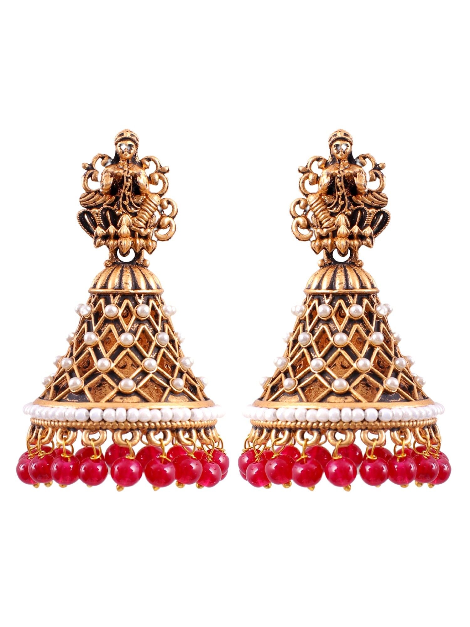 Traditional Red Jhumka Earrings with Antique Mata Laxmi Design for Temple Jewellery