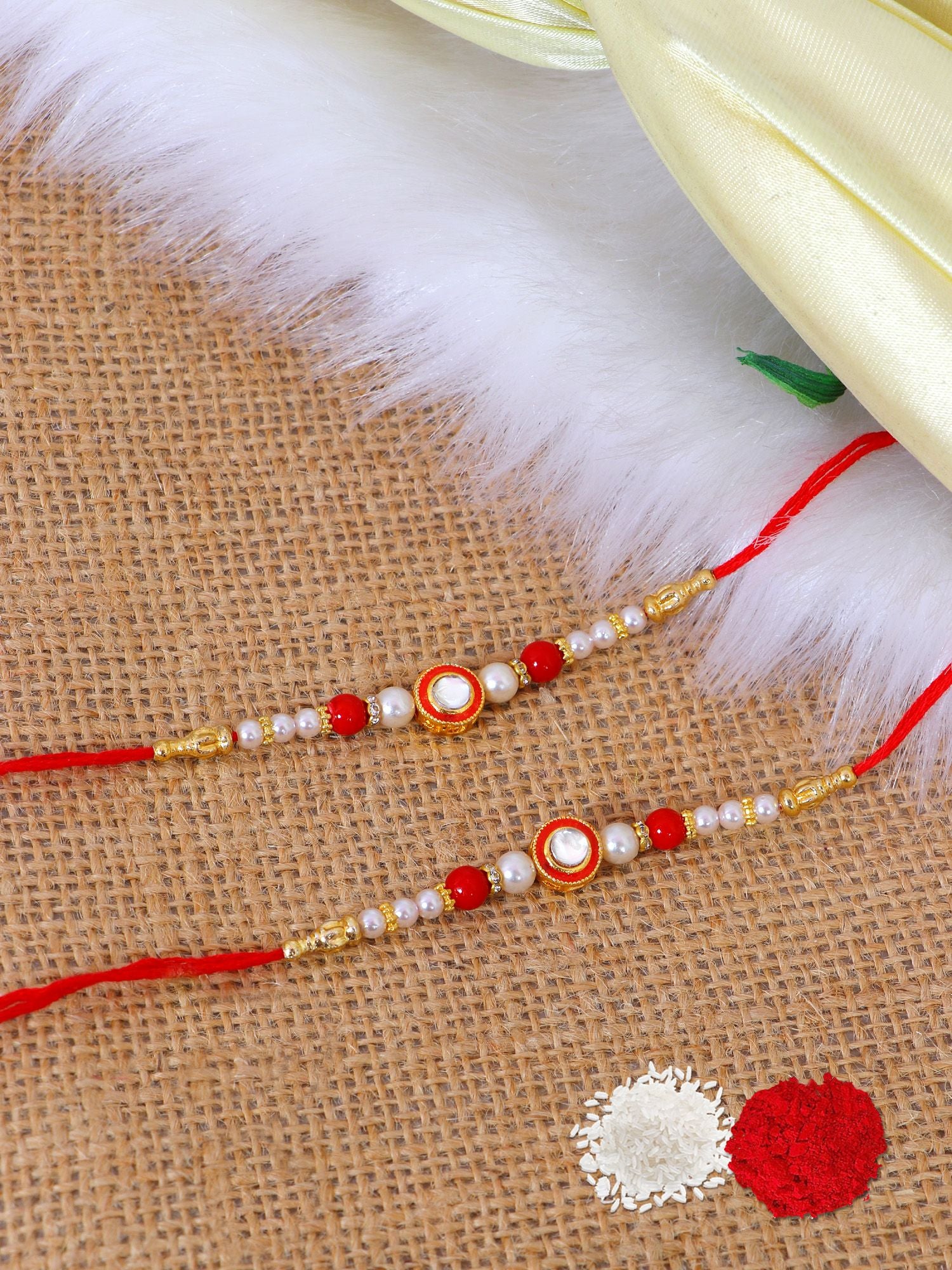 Designer Kundan Rakhi Gift Set for Brother - Red & White Beads, Pack of 2 with Roli Chawal Tilak