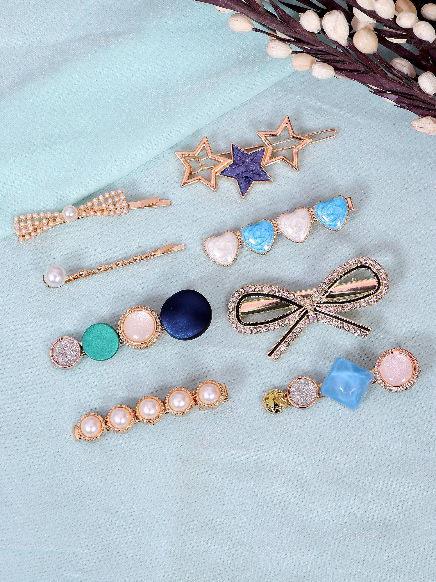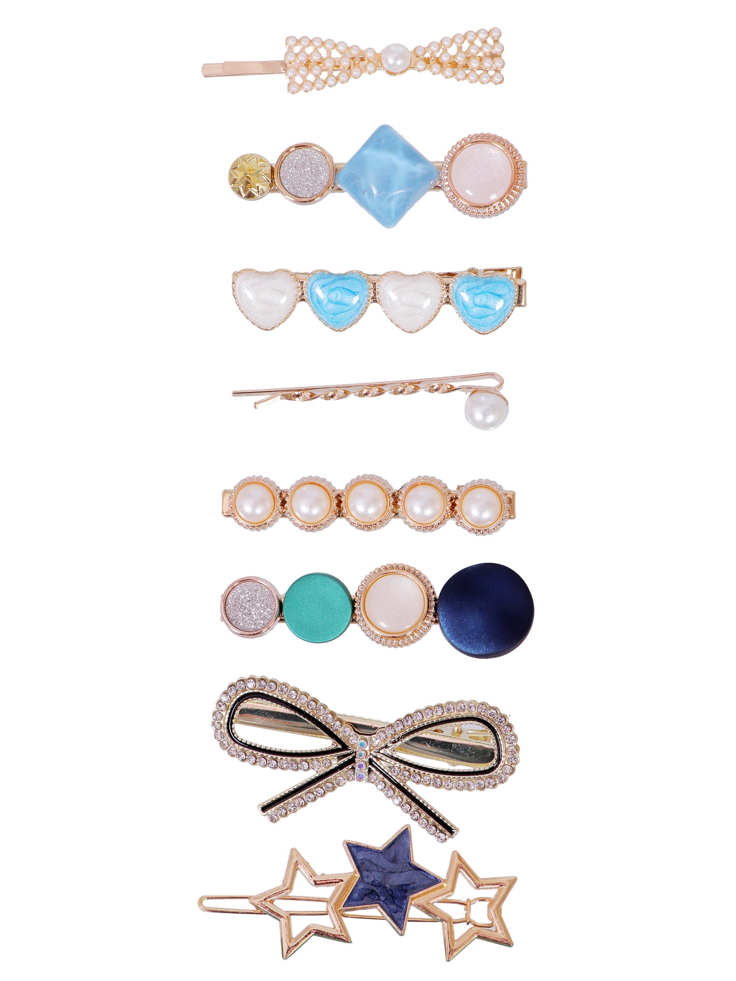 - Starry Night Hairpins -Multi Color Gold Toned Stone & Pearl Hair Clips for Girls -Pack of 8