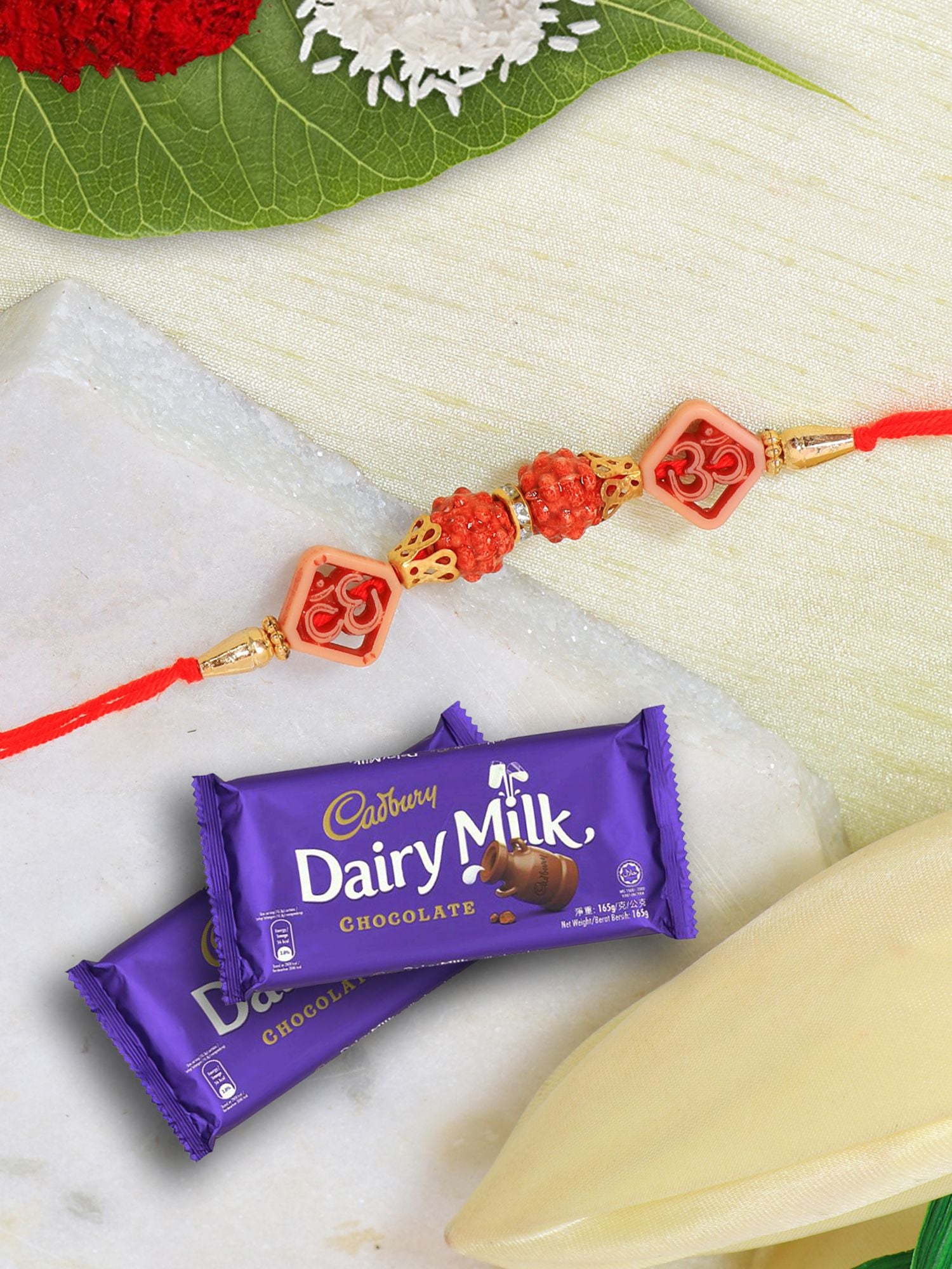 Om Rudraksha Rakhi & Dairy Milk Gift Set for Dear Bros