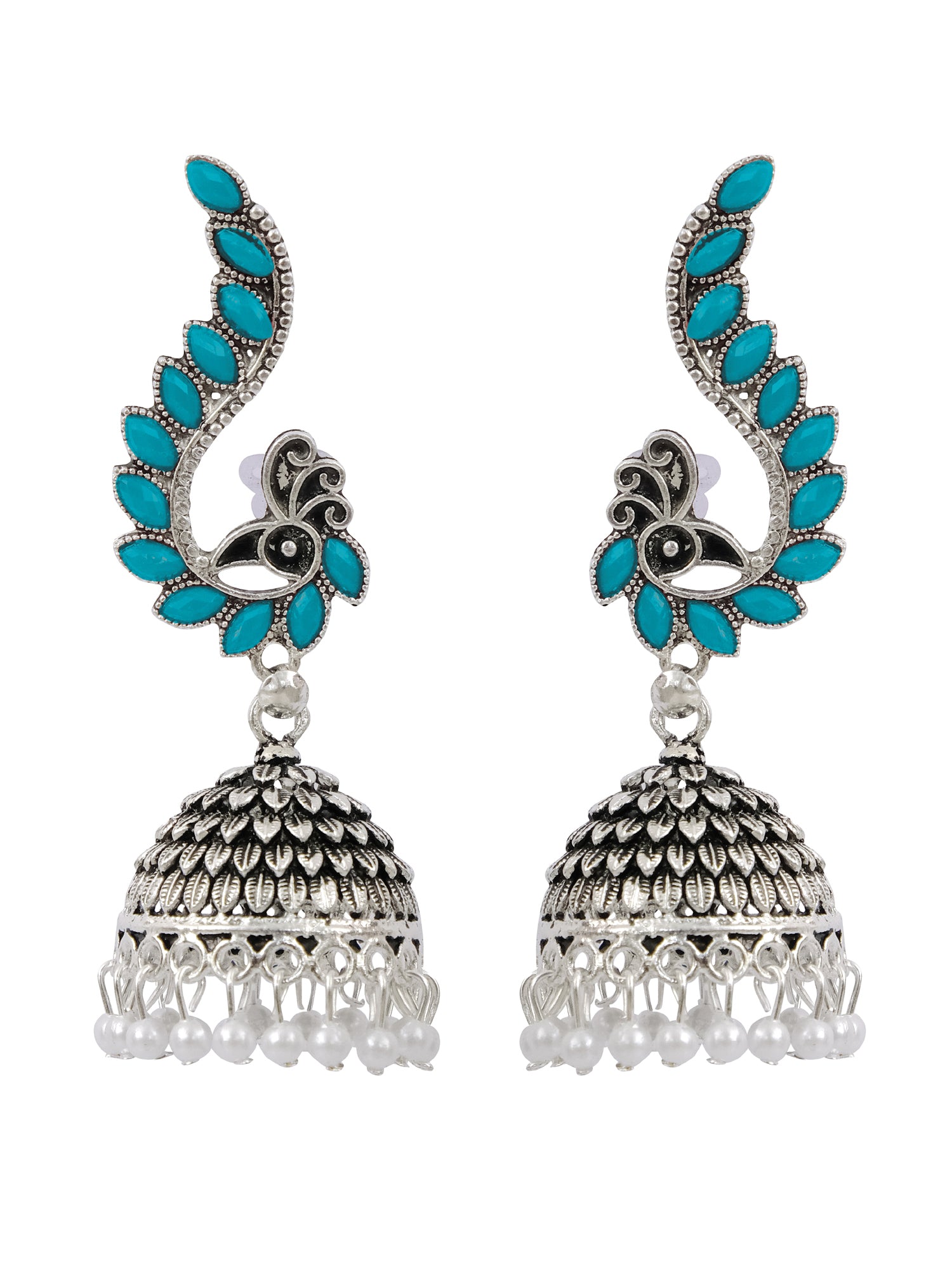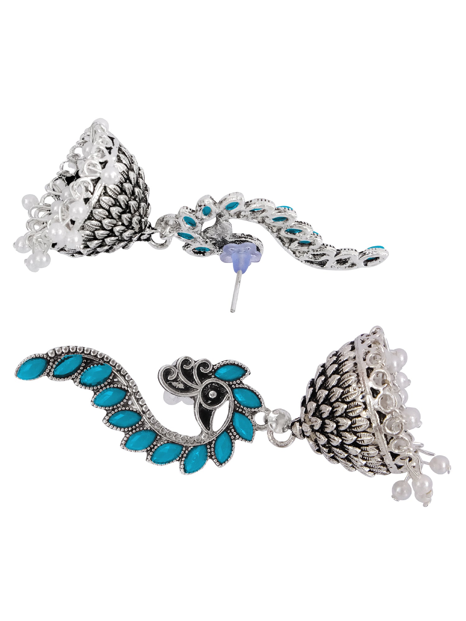 Oxidised Silver Meenakari Beautiful Blue Peacock Design Jhumka Earring