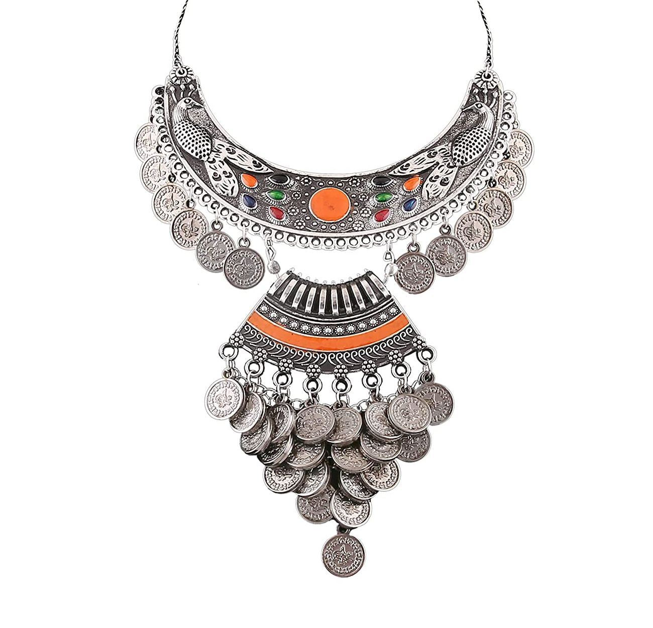 - Oxidised Coin Charm - Silver Plated Statement Necklace for Women