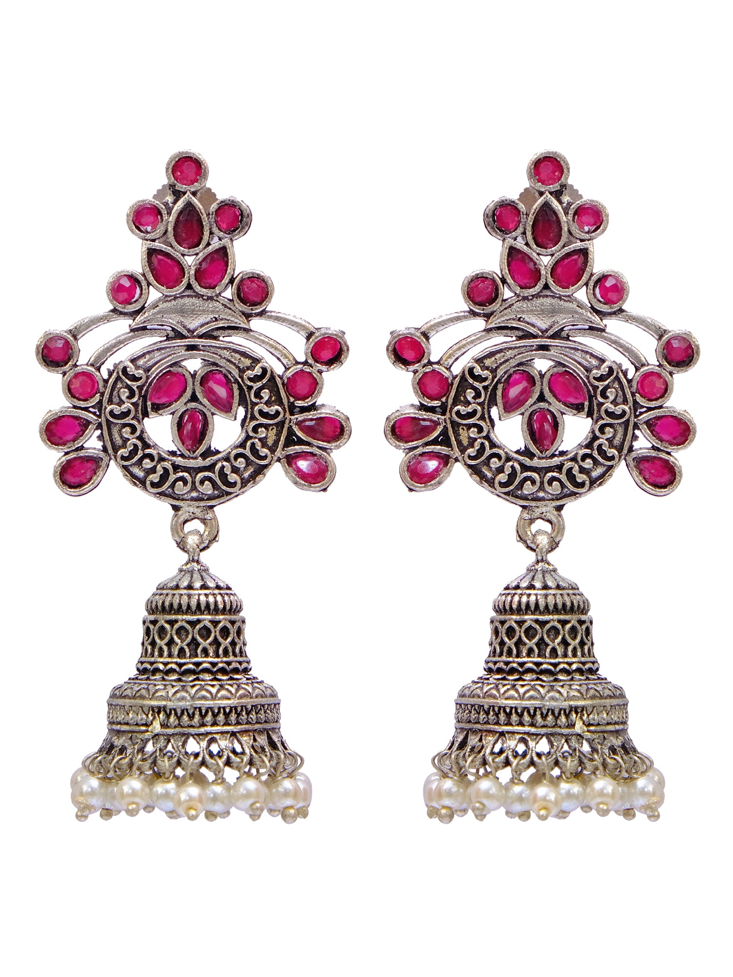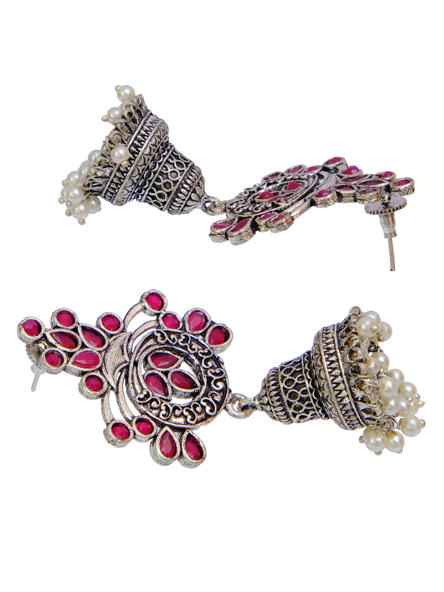 New Design Oxidized Silver Jhumka Earrings for Women with Pink Floral Elements and Pearls