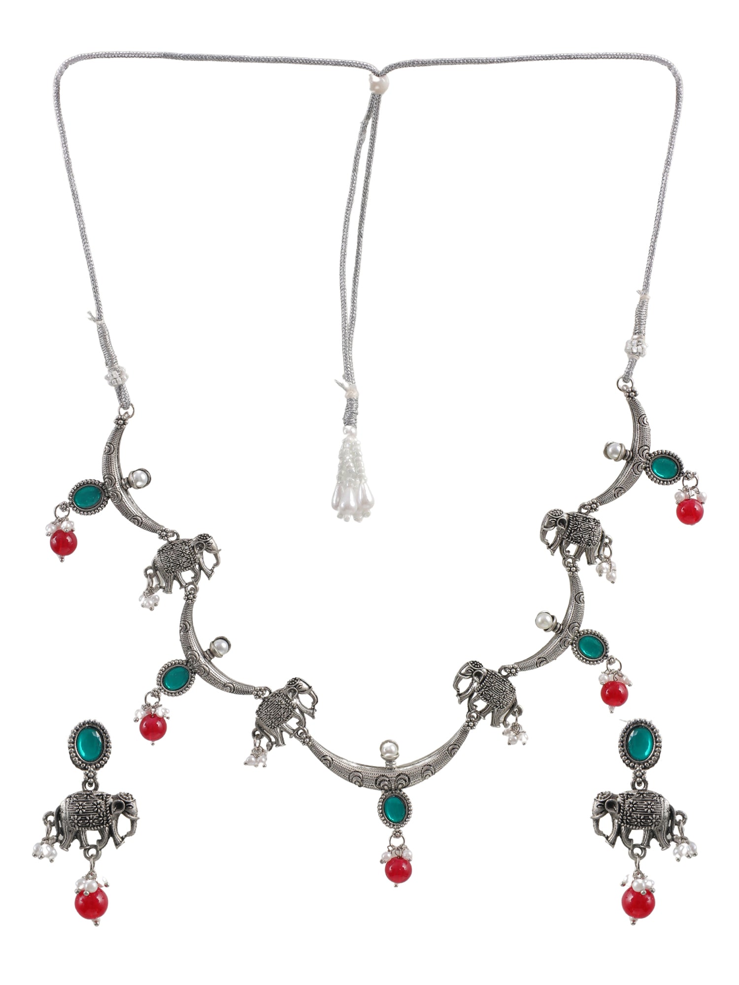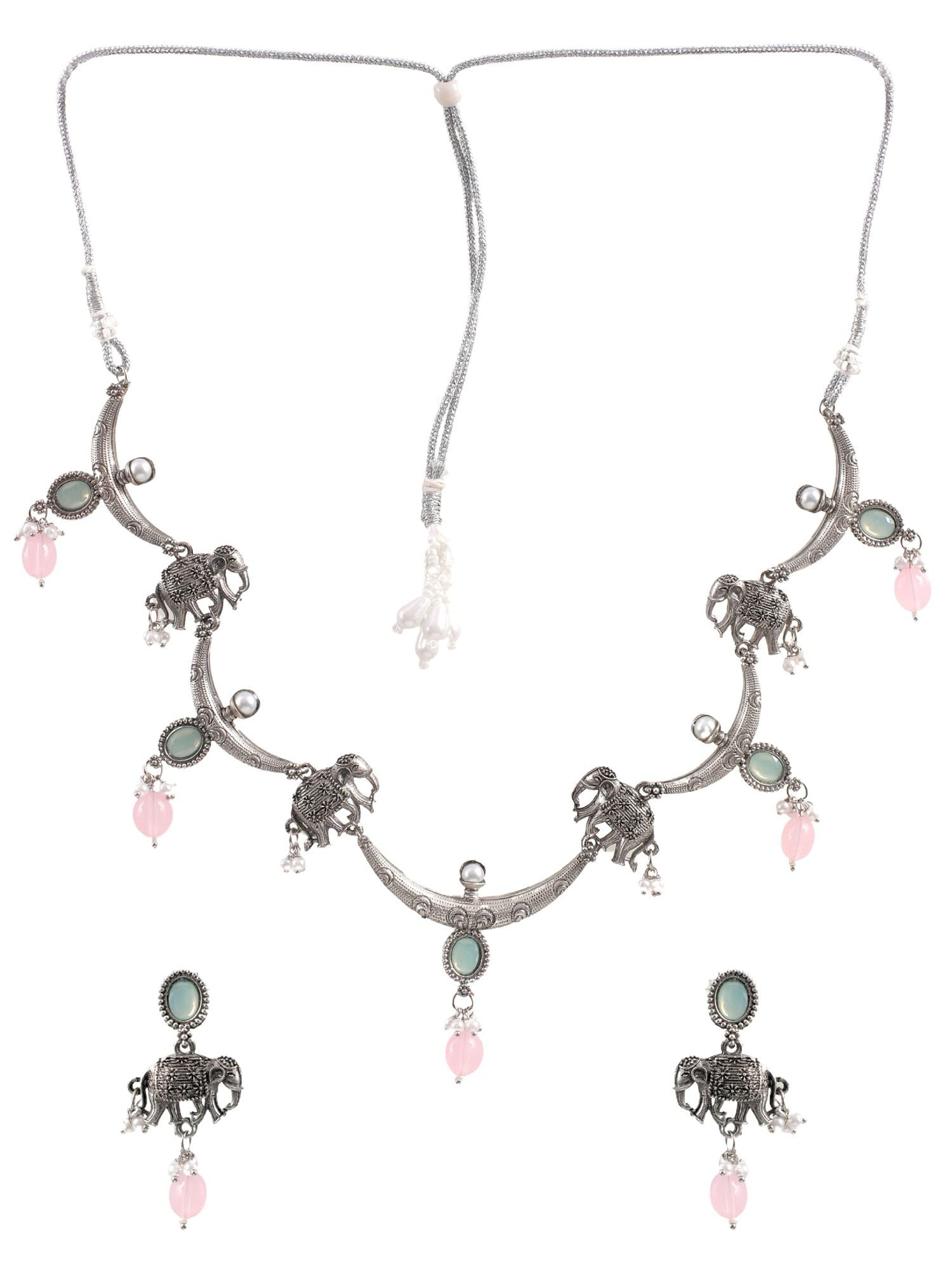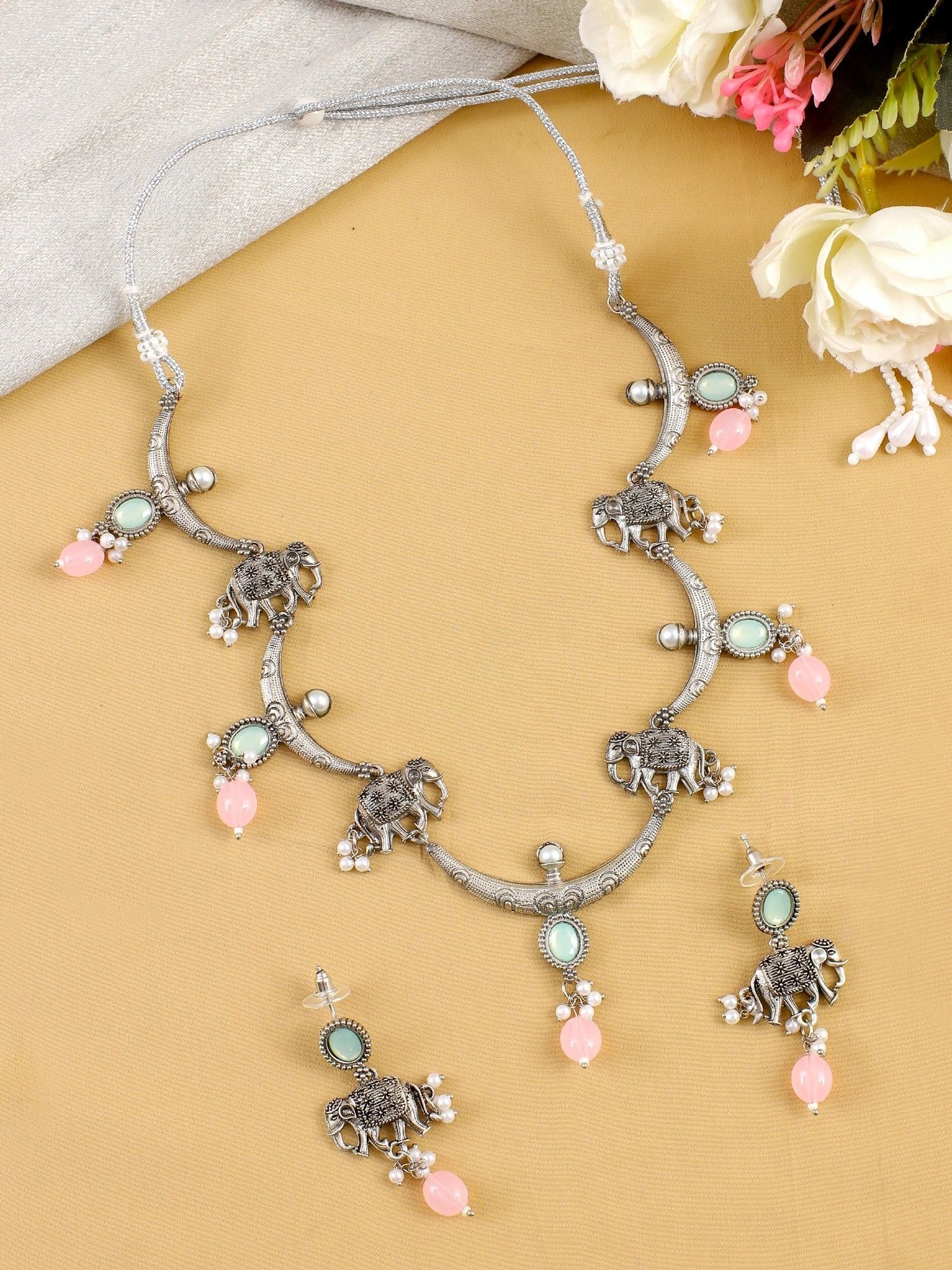 - Oxidised Silver Elephant Pattern Pink-Mint Green Drops Jewelry Set for Women