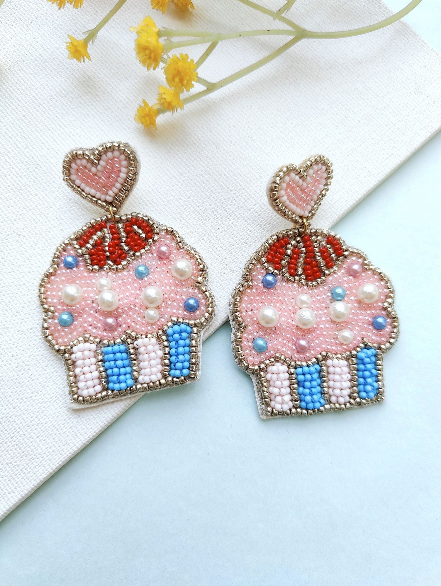Pink Cupcake Handmade Beaded Earrings: Quirky Statement Accessory for Women & Girls