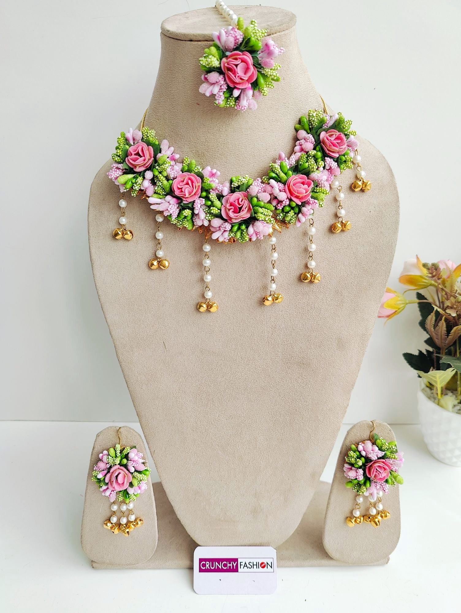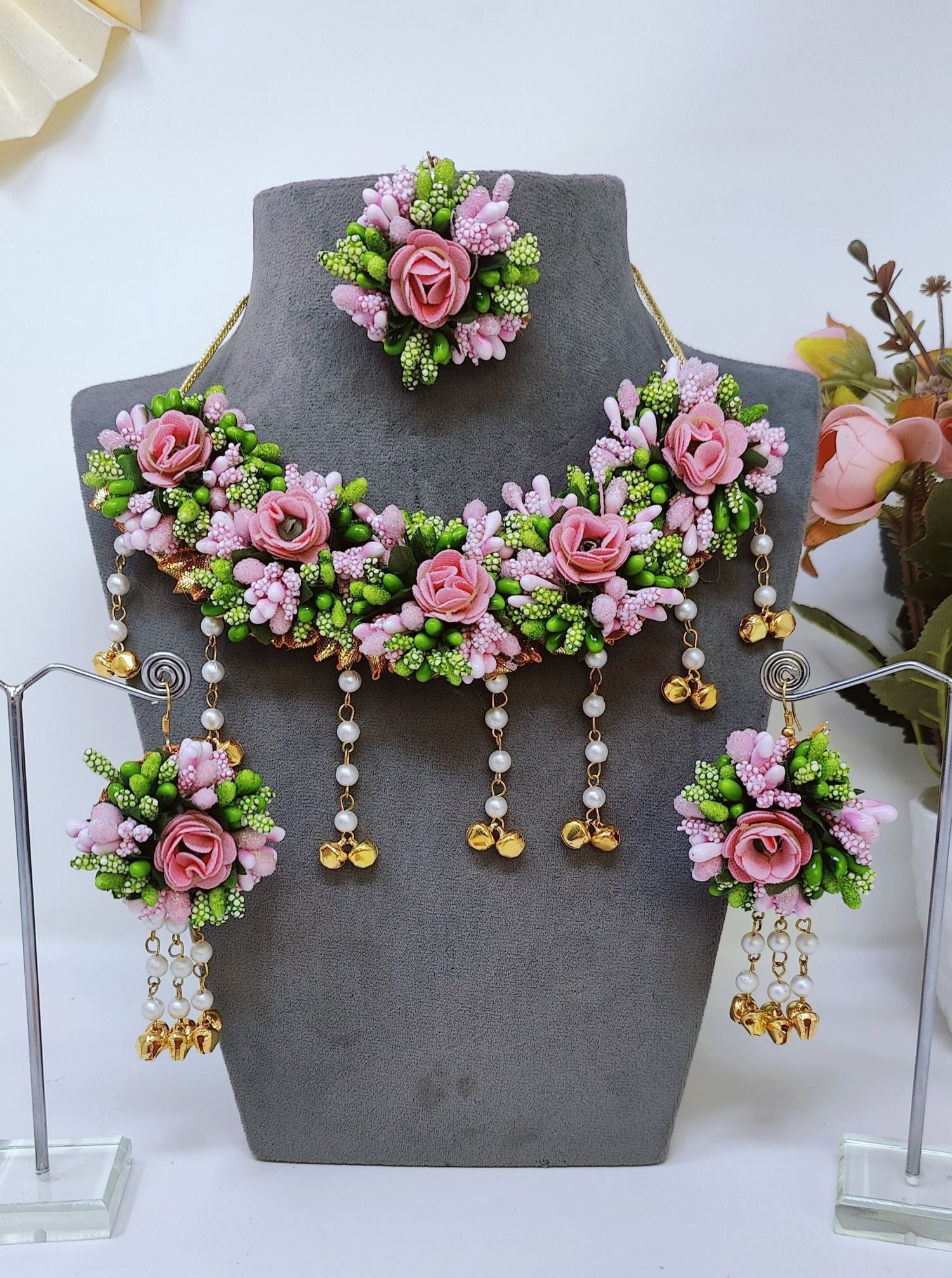 Pink-Green Artificial Floral Jewellery Set for Haldi, Mehndi