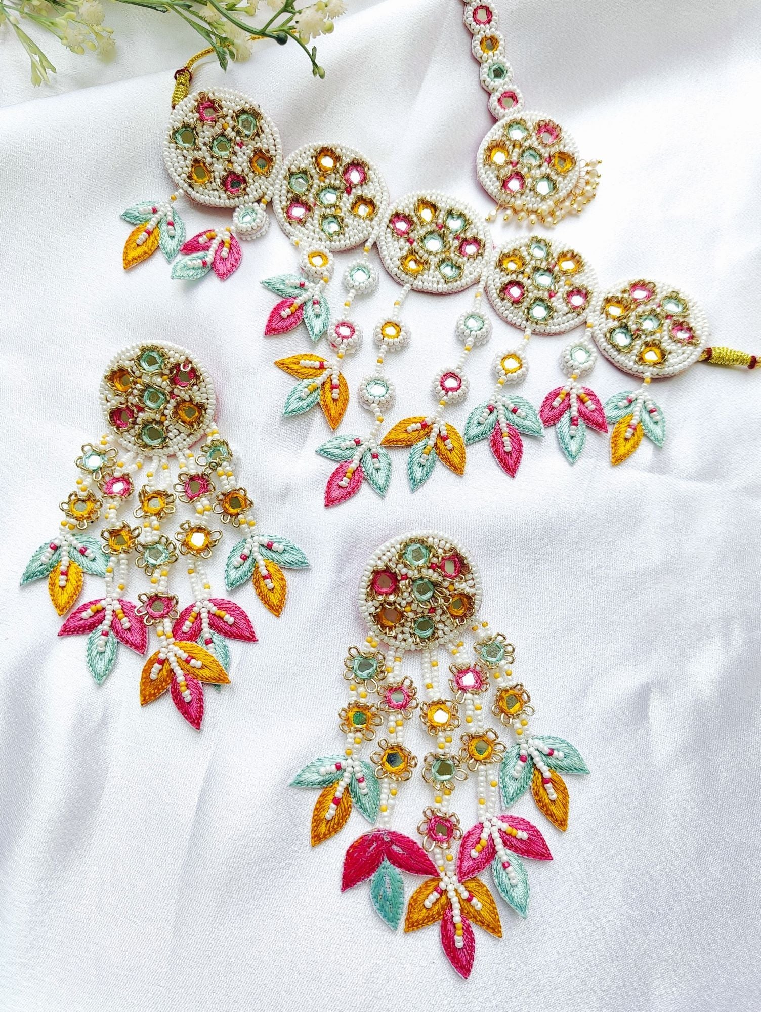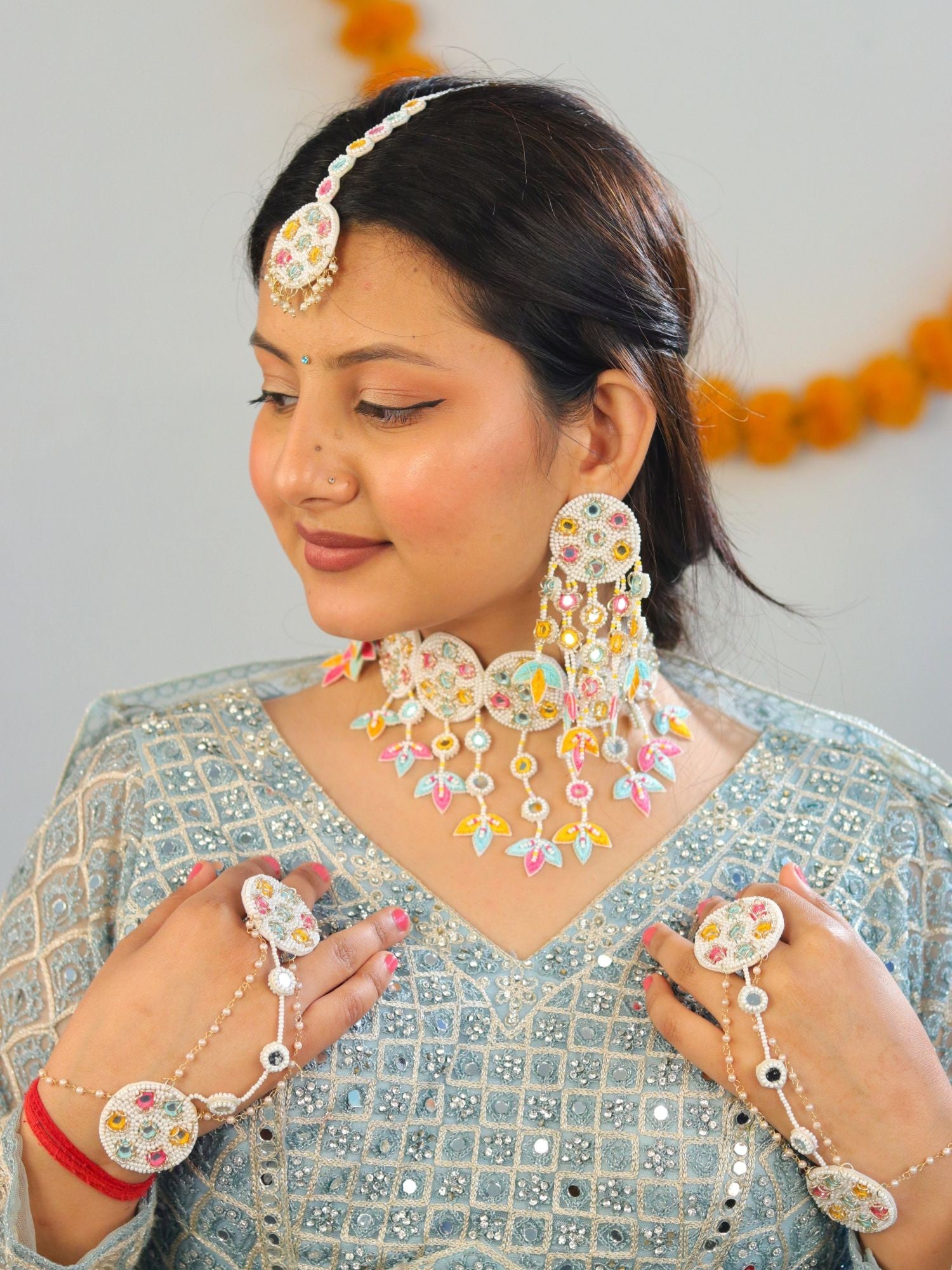 Pink-Orange-Sky Blue Handmade Floral Jewelry Set for Haldi Mehndi