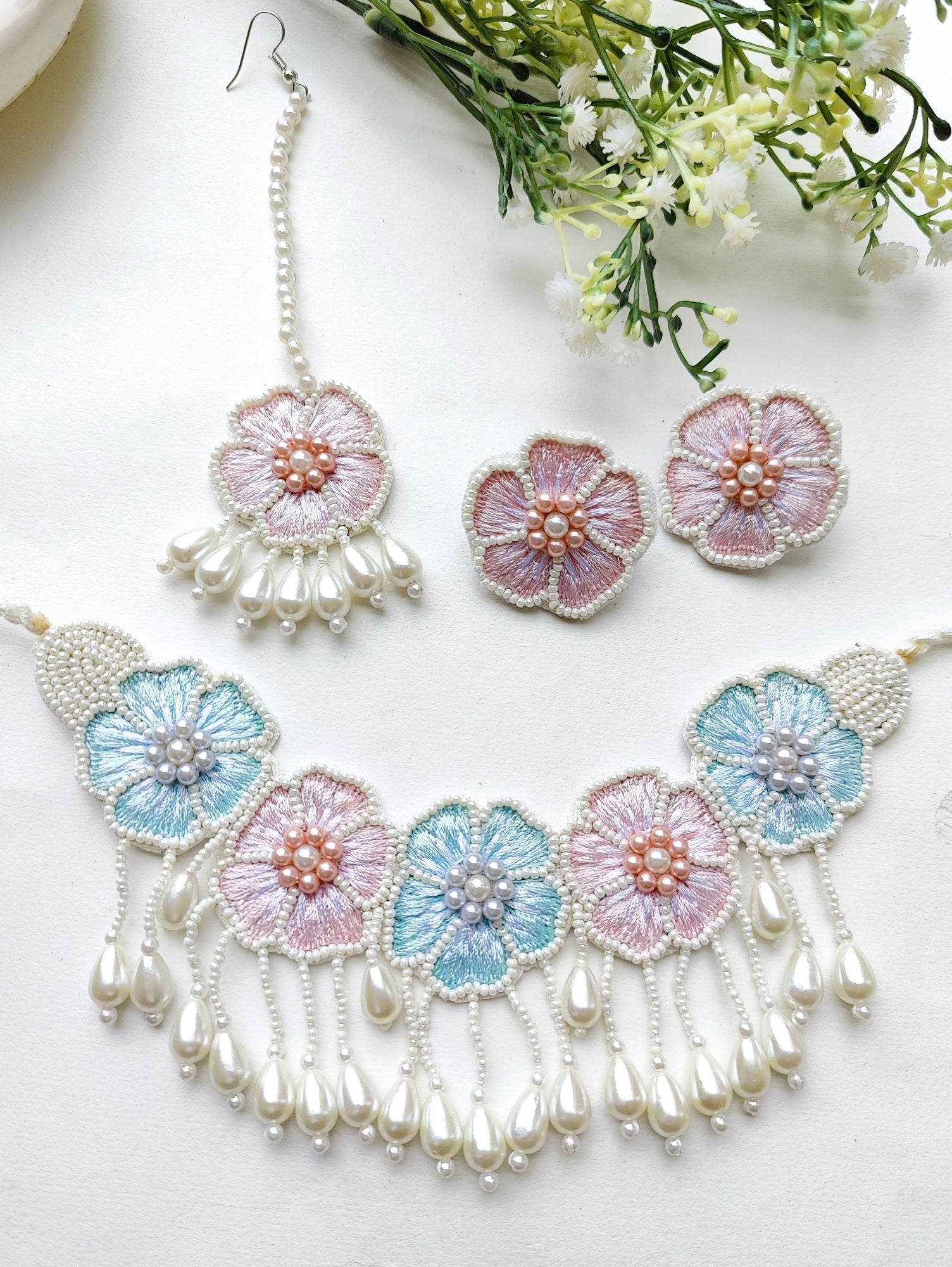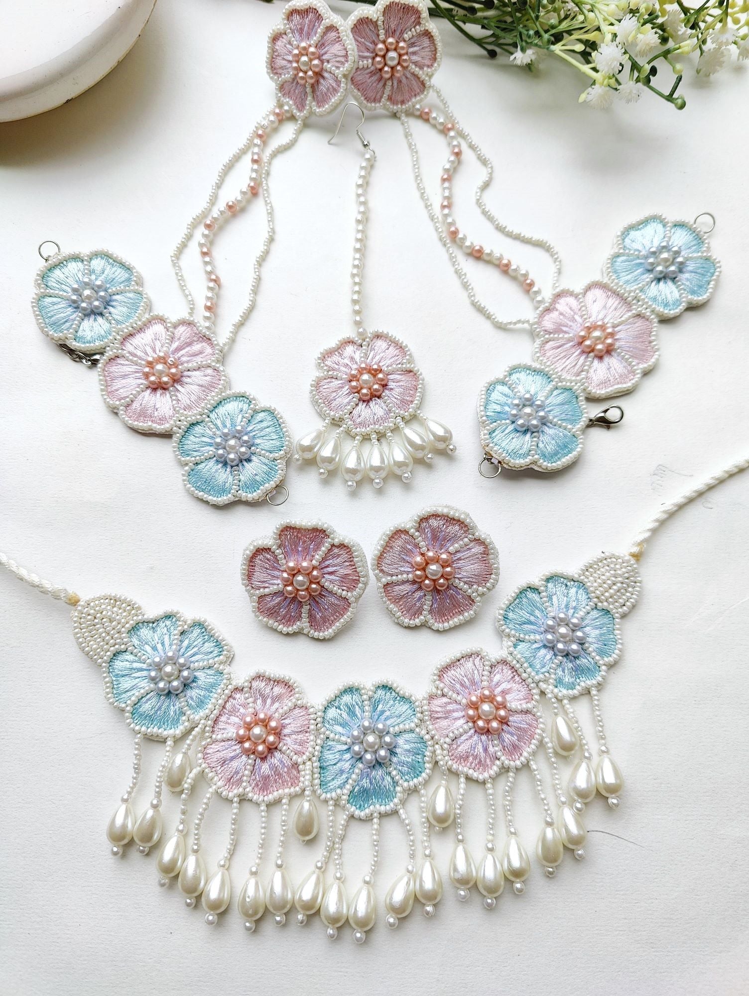 Pink-Sky Blue Bridal Haldi-Mehndi Beaded Floral Jewellery Sets