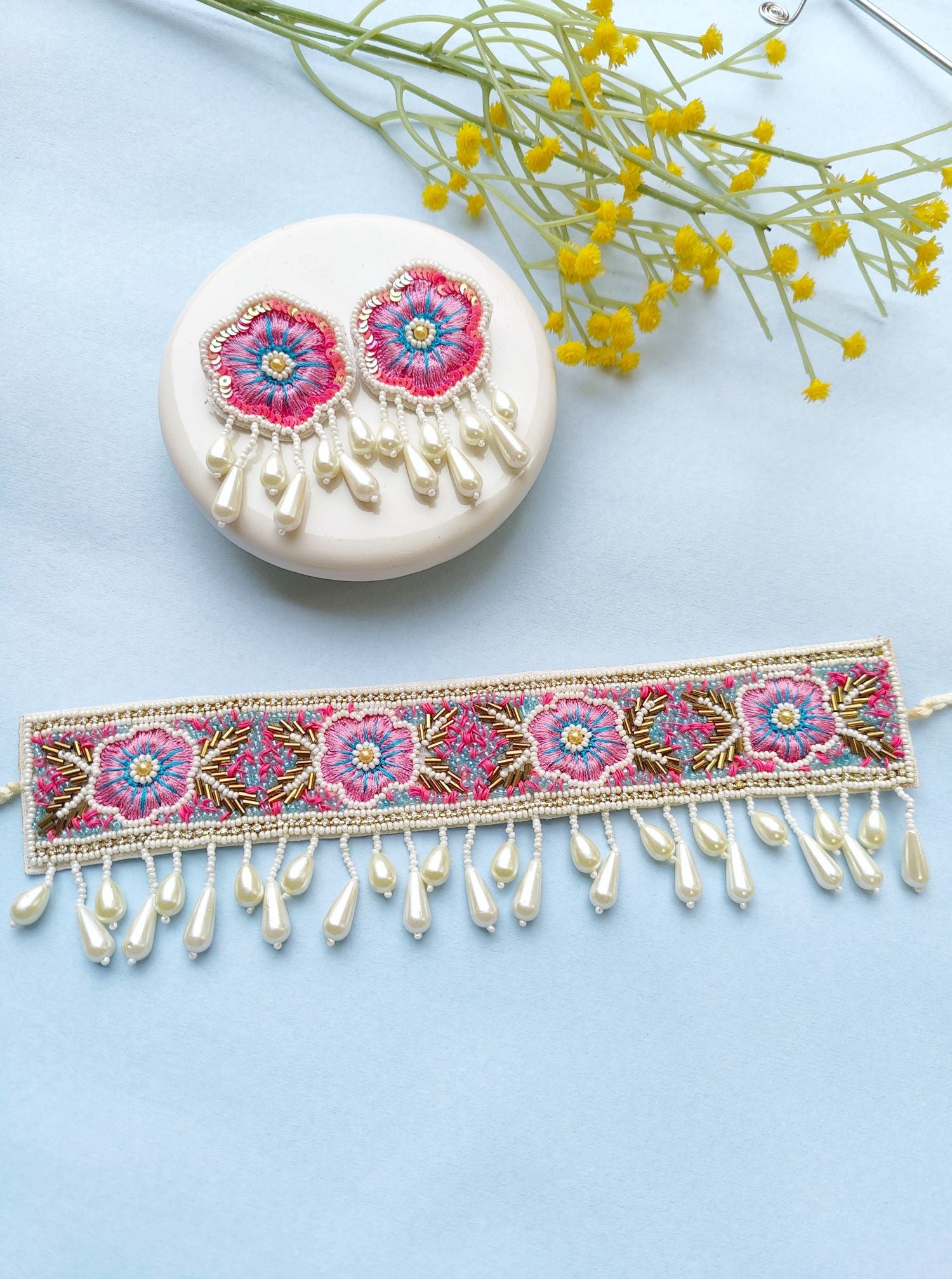 Handcrafted Pink-Sky Blue Floral Embroidery Haldi Necklace Set