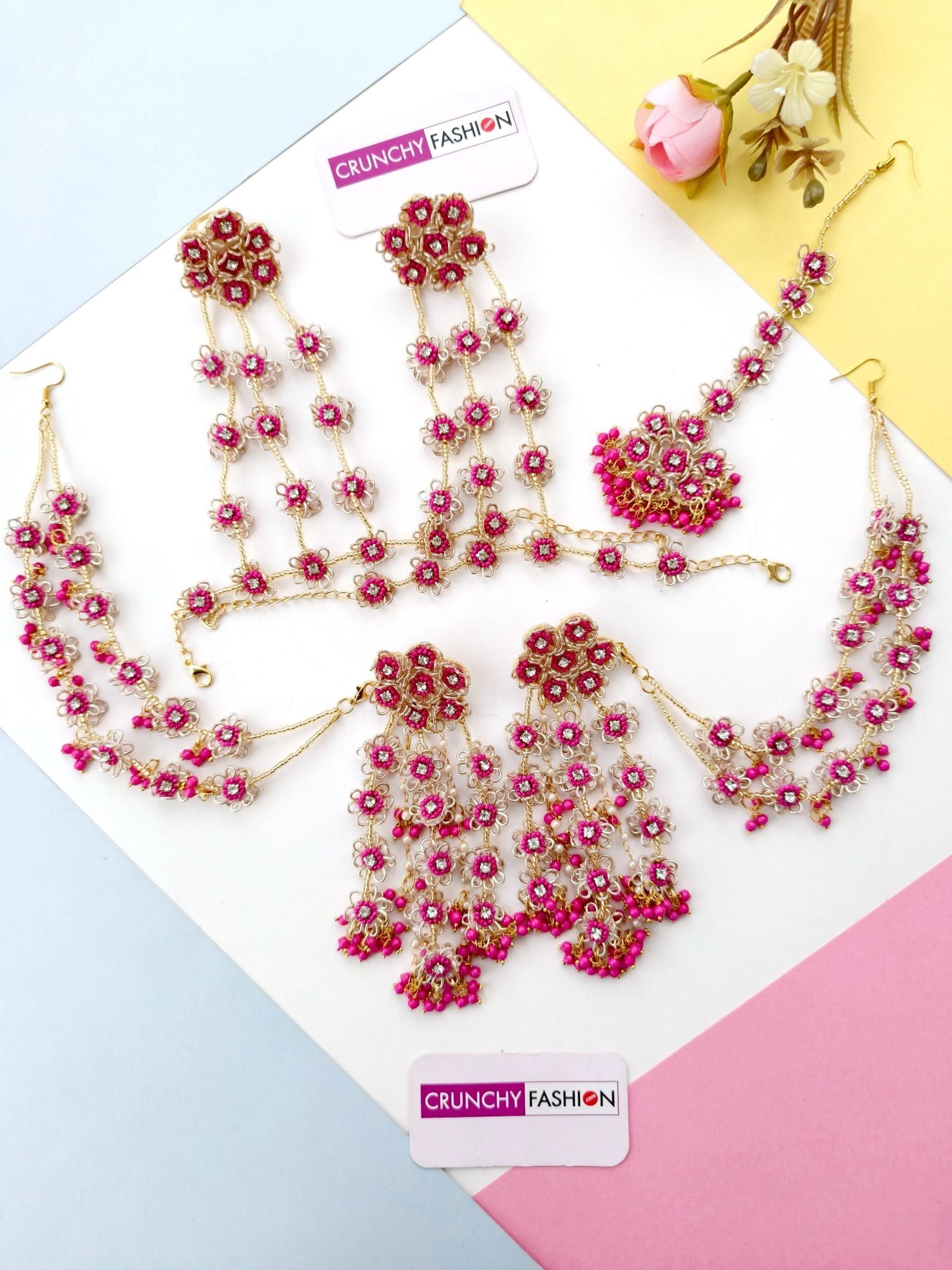 Pink-Yellow Beaded Floral Earrings with Earchain, Tikka , Hathphool set