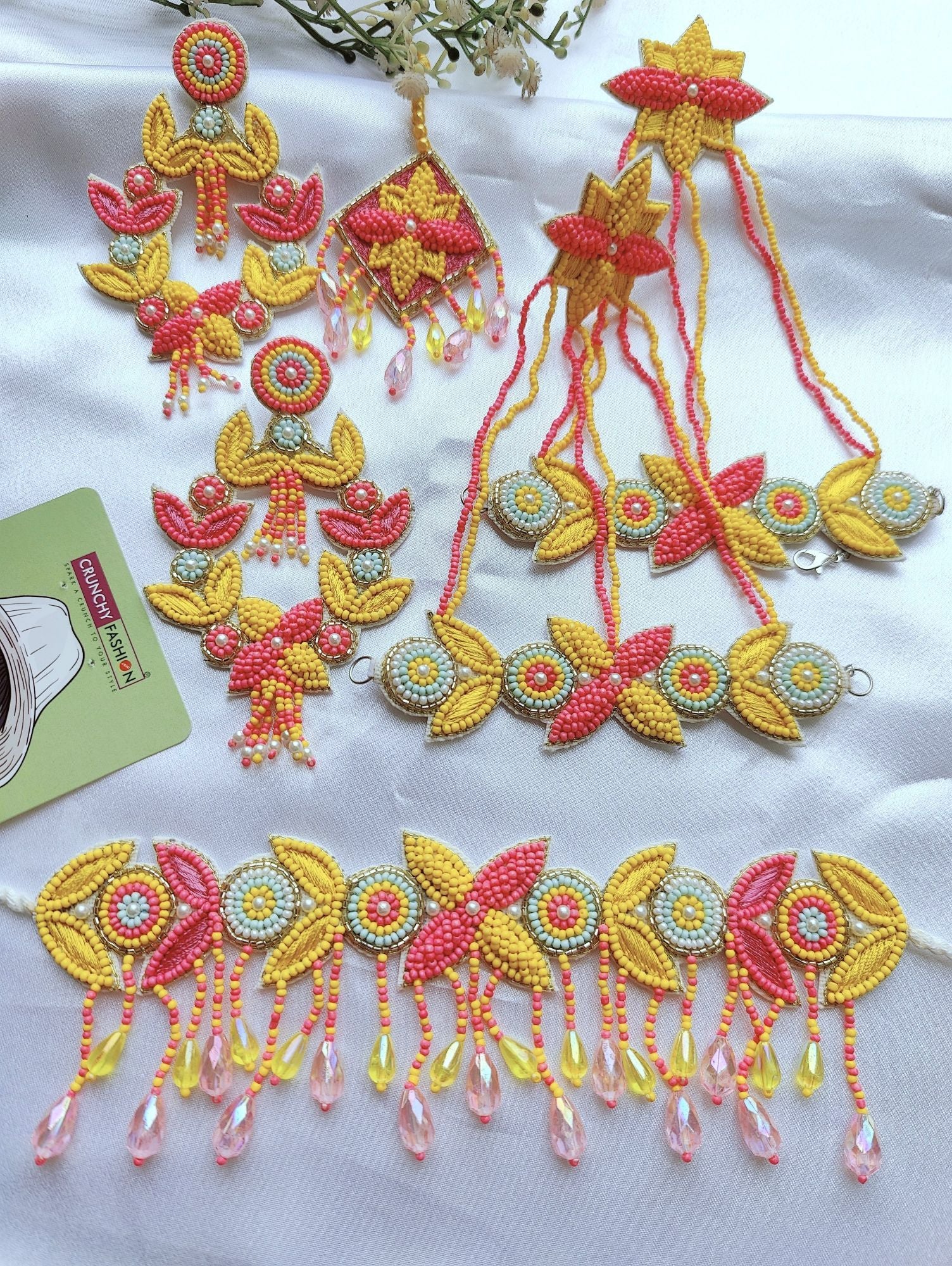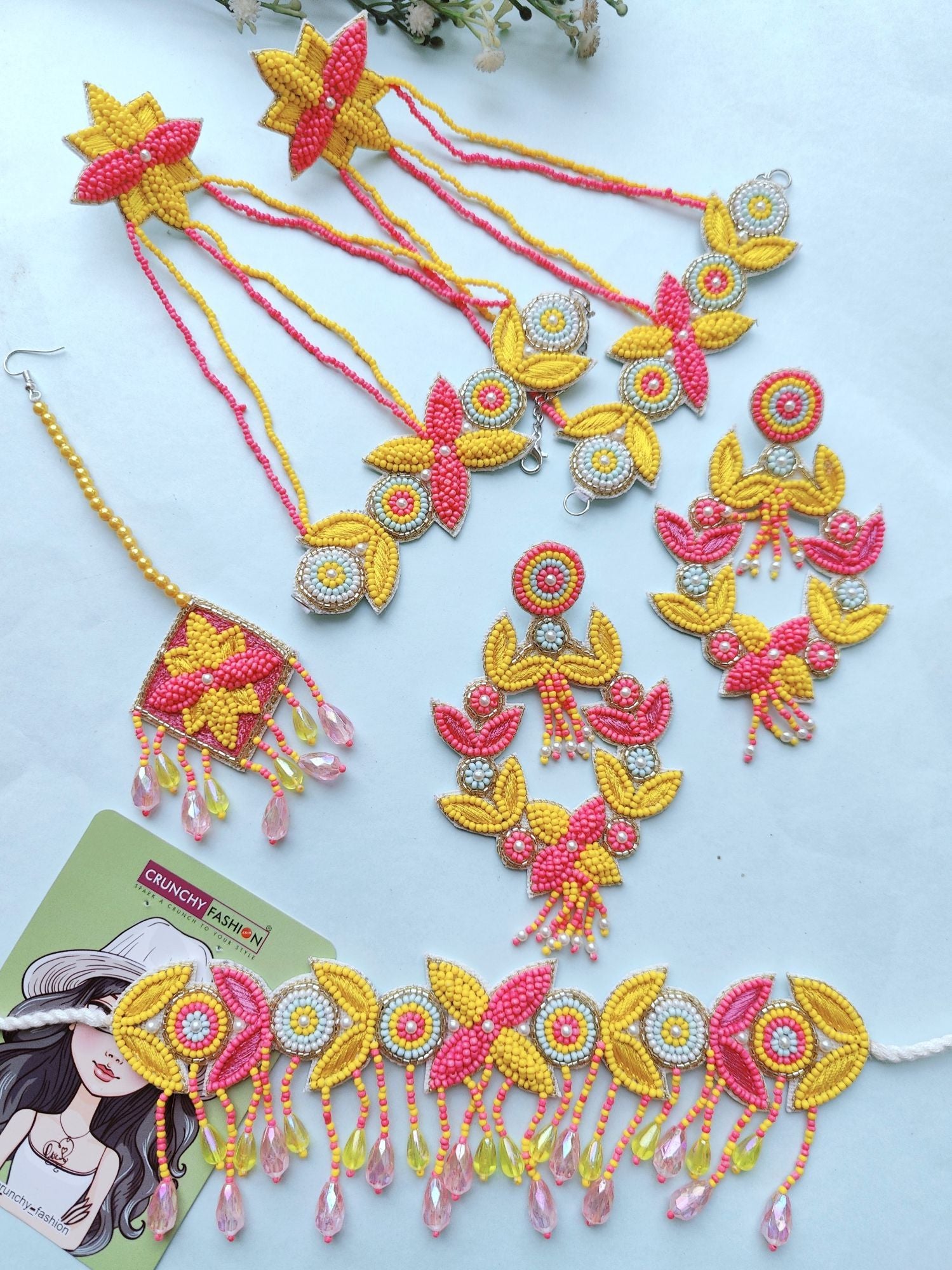 Pink-Yellow Floral Beaded Jewelry for Haldi-Mehndi, Carnival