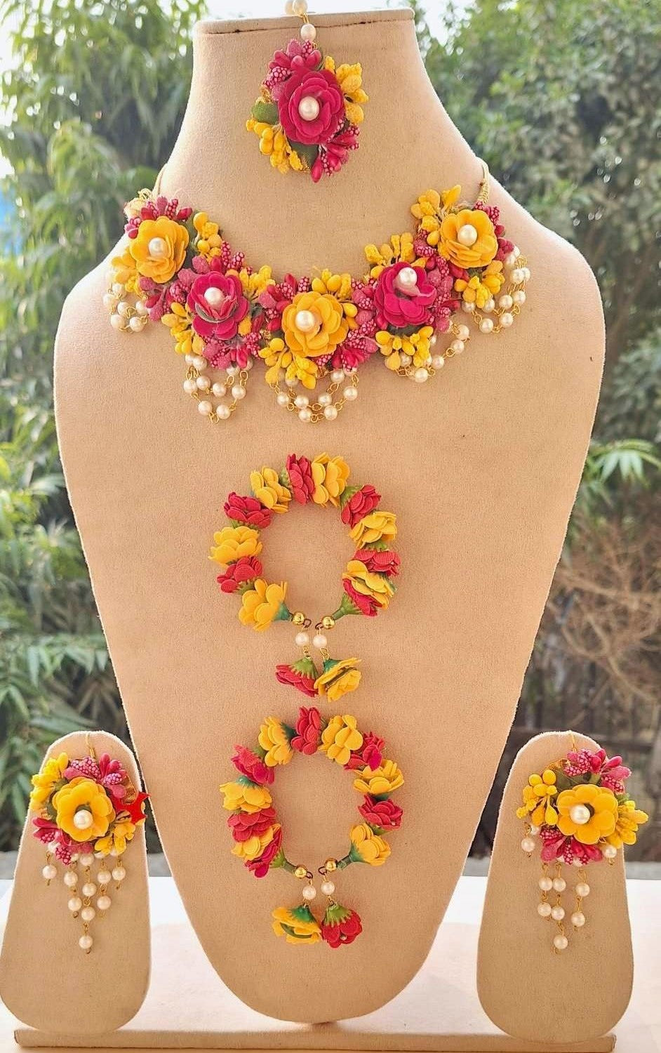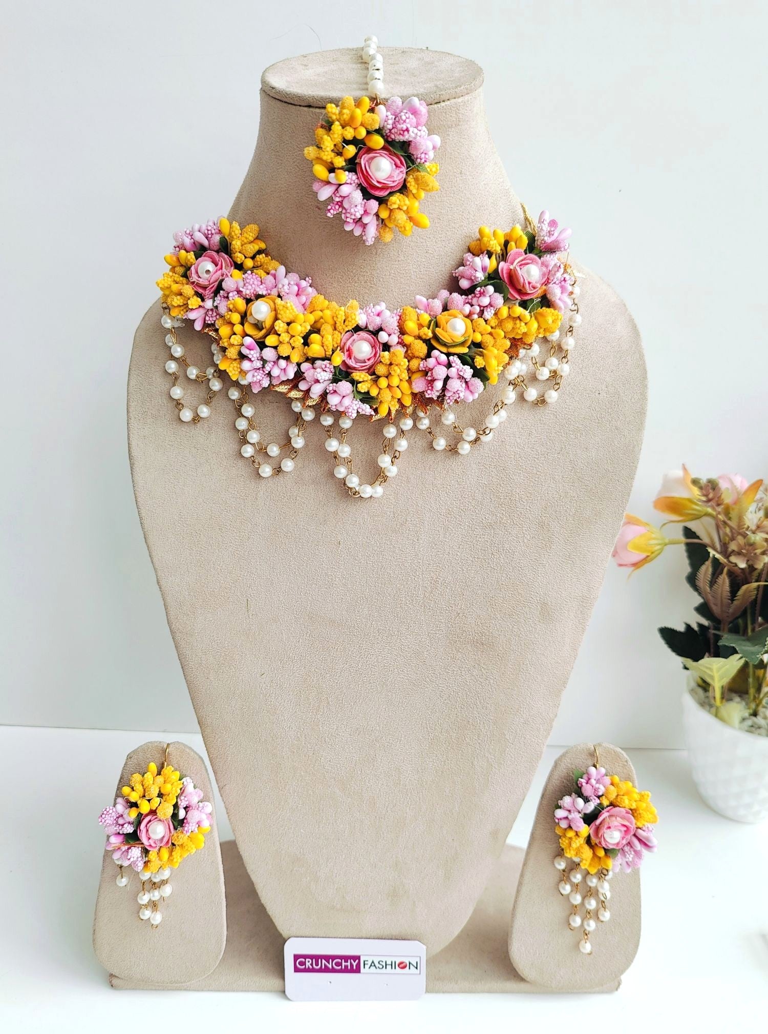 Pink-Yellow Floral Jewellery Set for Haldi Mehndi Baby SHower