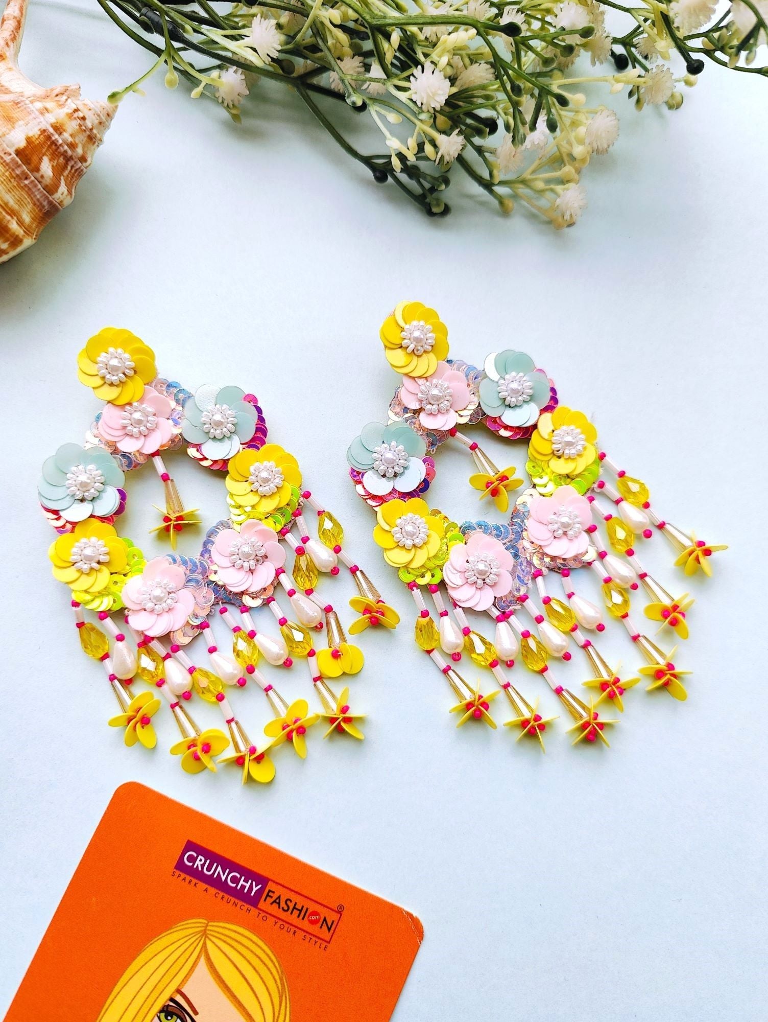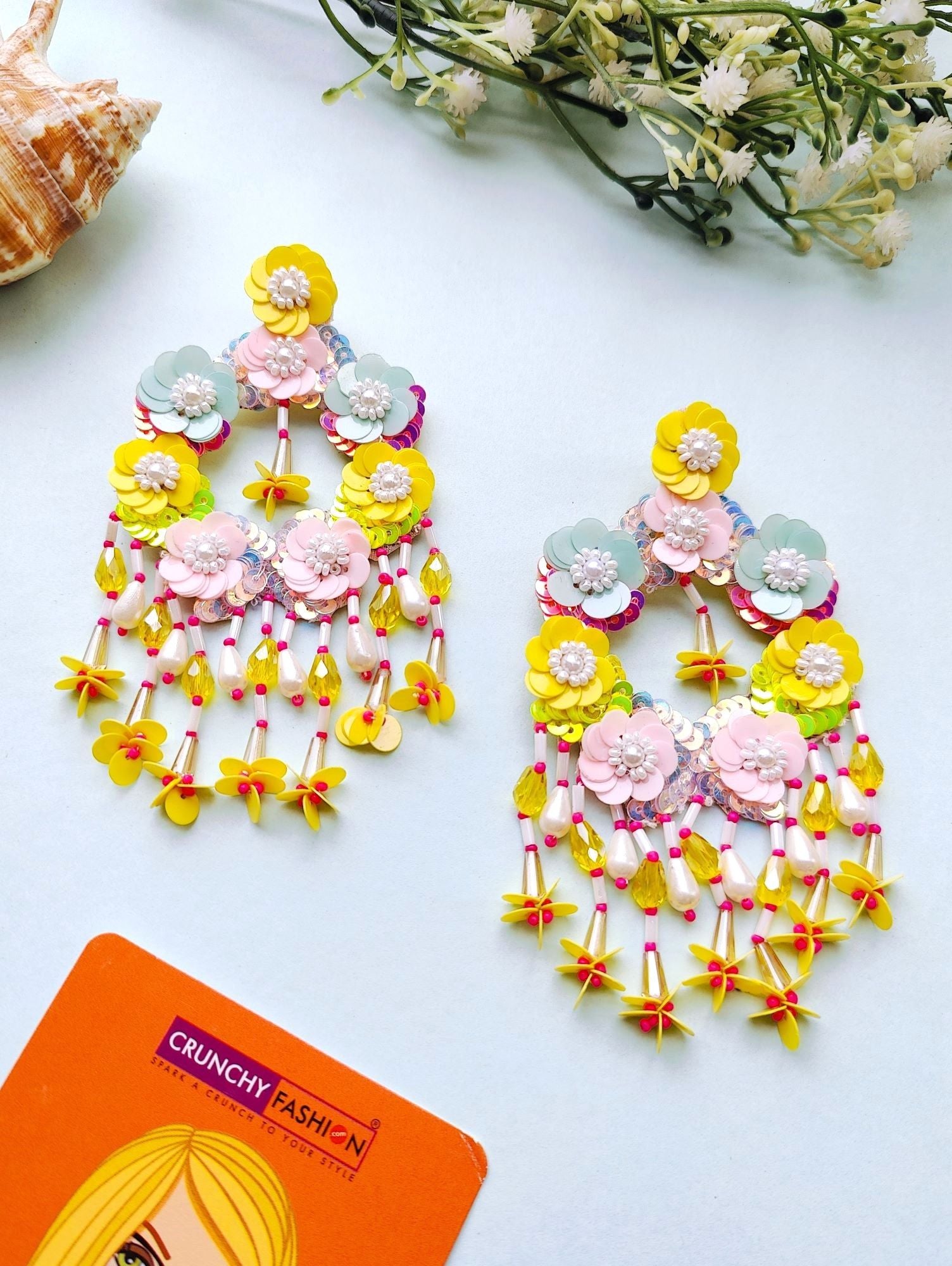 - Radiant Floral Symphony: Handcrafted Pink-Yellow-Skyblue Beaded Earrings for Women