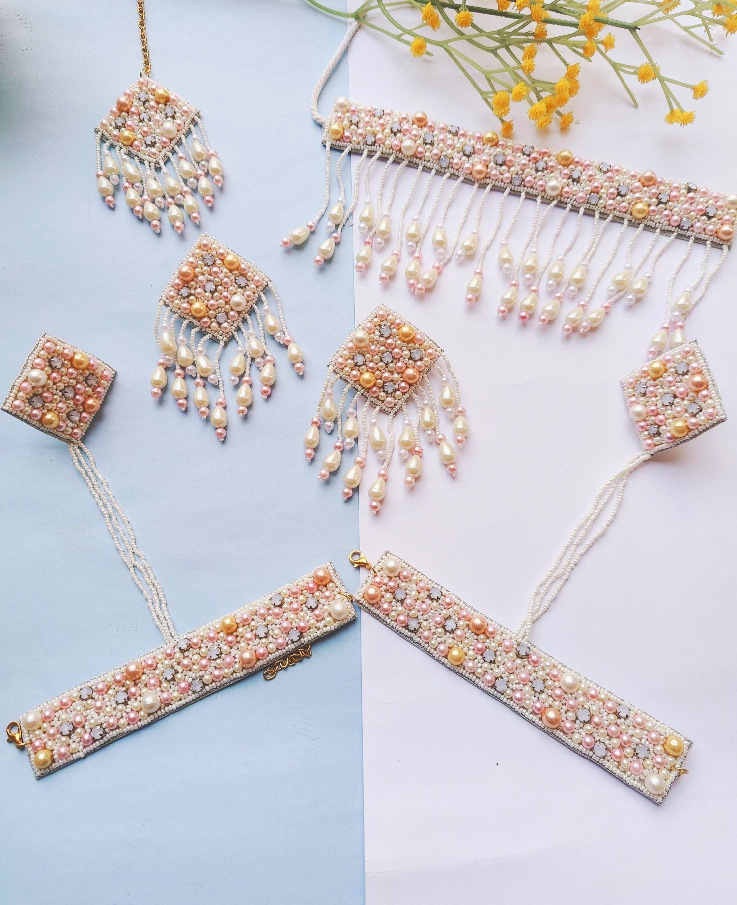 Floral Elegance: Handmade Pastel Pink Haldi-Mehndi Jewelry Set