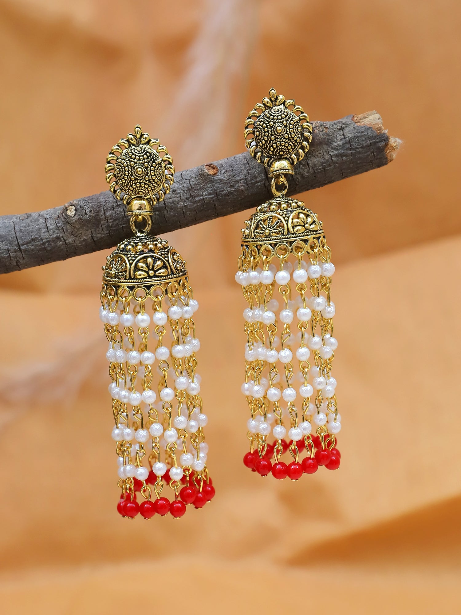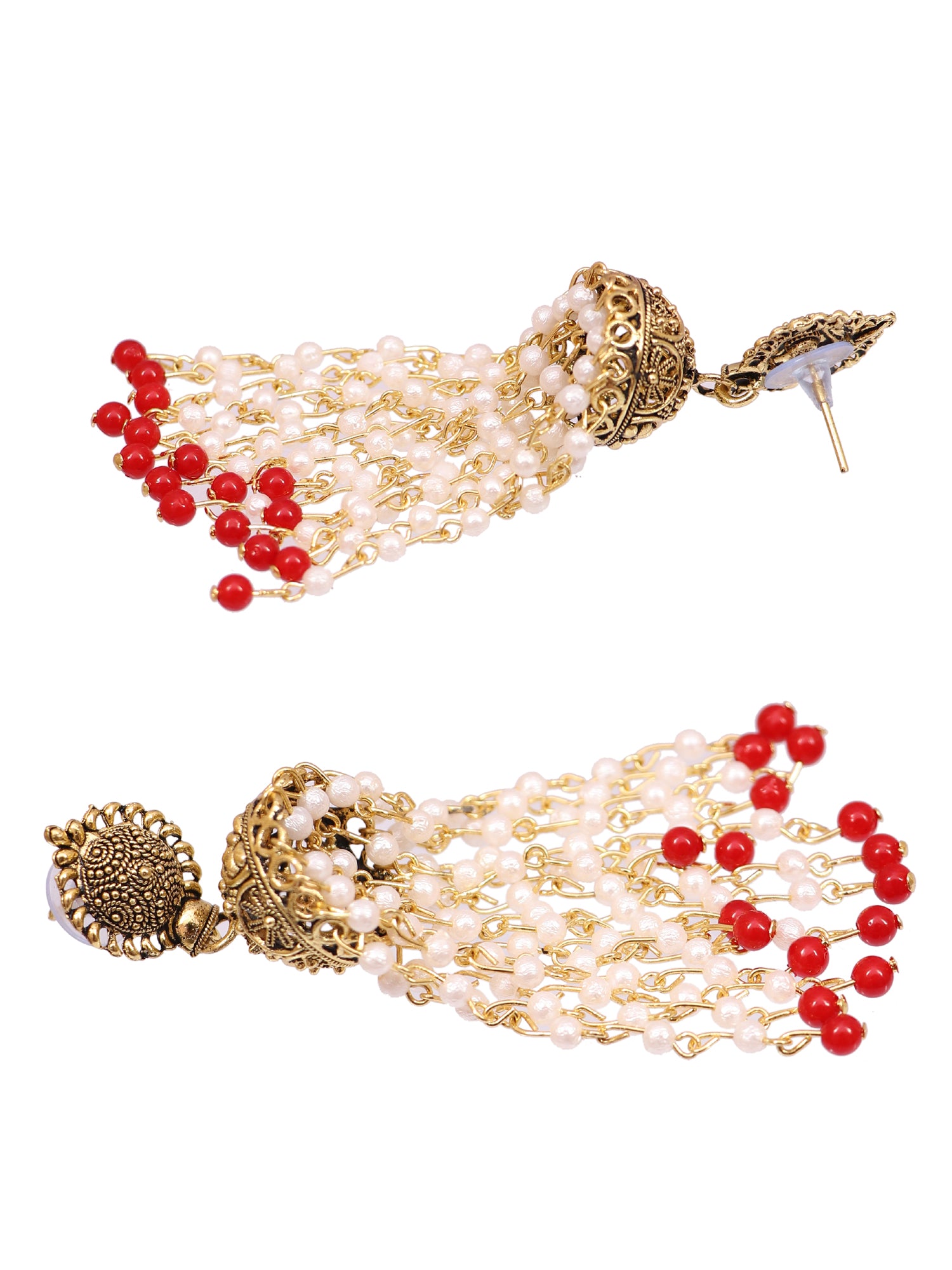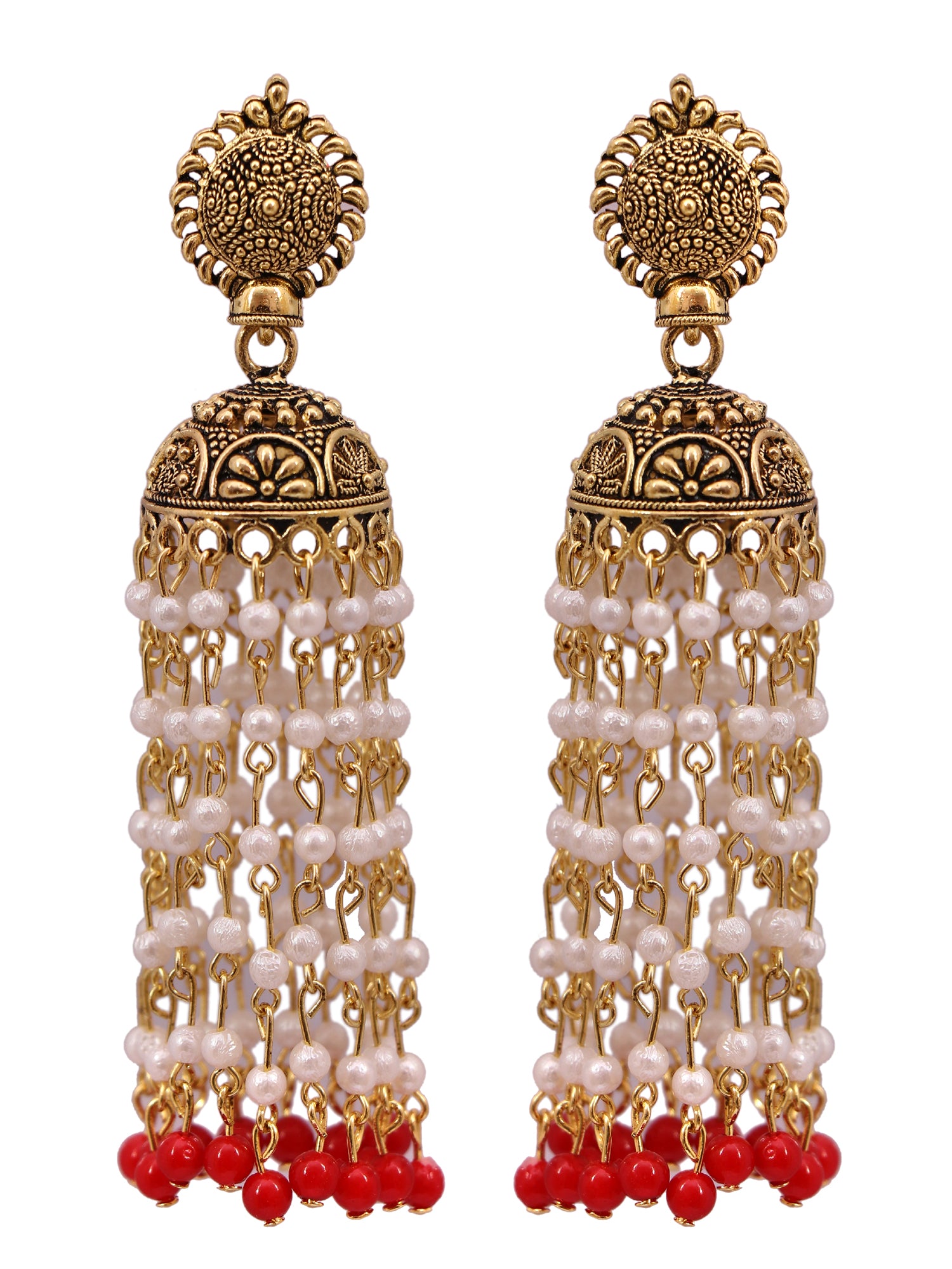 - Punjabi Traditional Gold Finished Kundan Pearl Jhumki Style Earrings with Red & White Accents