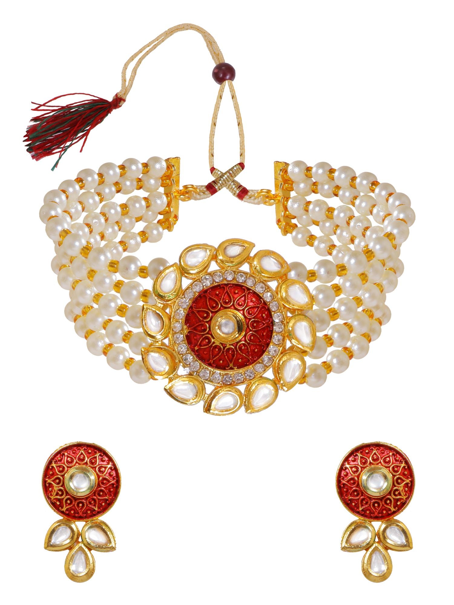 Red Kundan & Pearl Choker Necklace & Earring Set for Wedding Parties