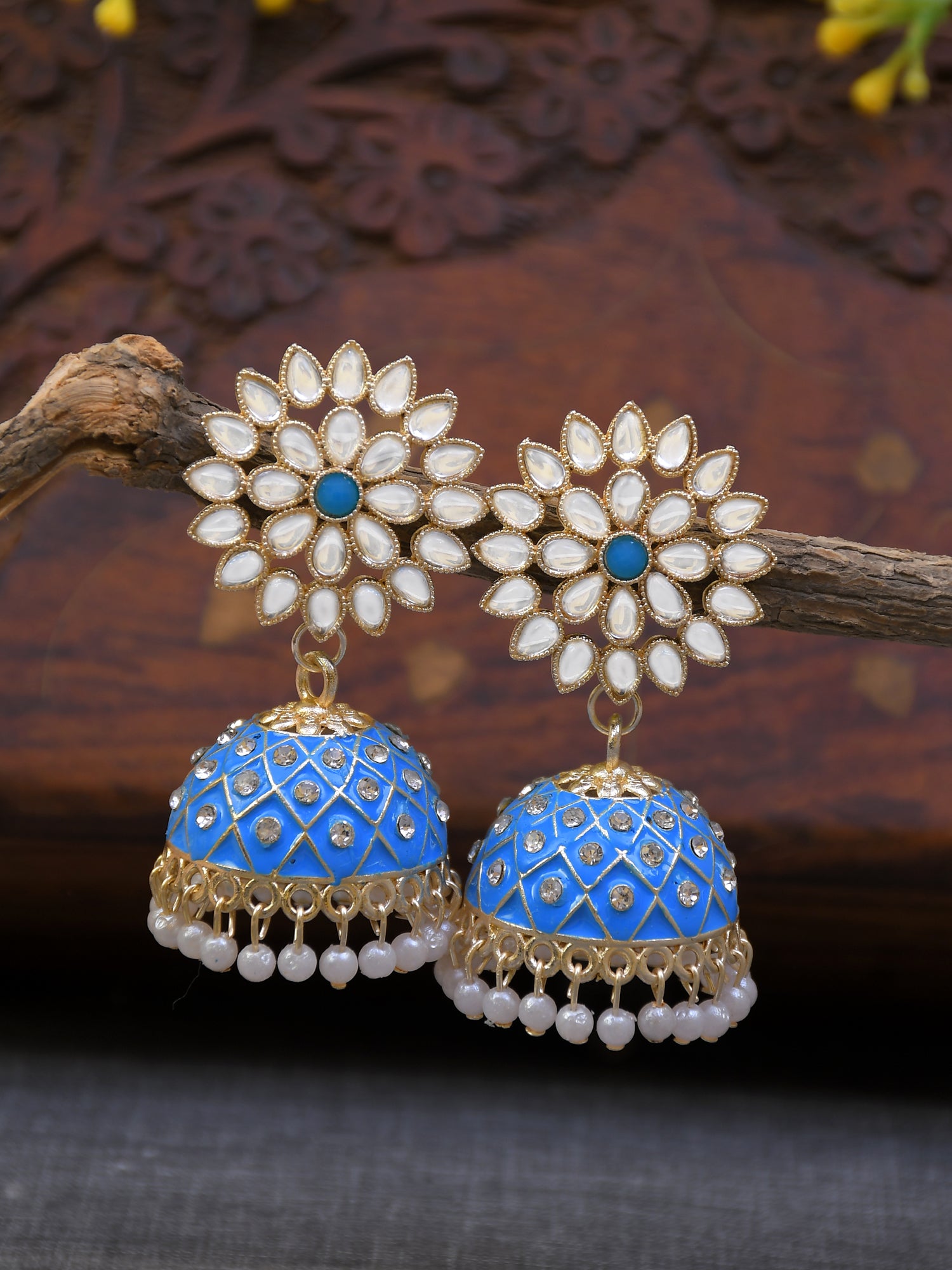 The earrings feature a stylish design with intricate meenakari work that adds a pop of color to the gold-plated finish. The lightweight construction ensures that they're comfortable to wear all day long, while the traditional jhumka shape adds a touch of sophistication to any outfit.