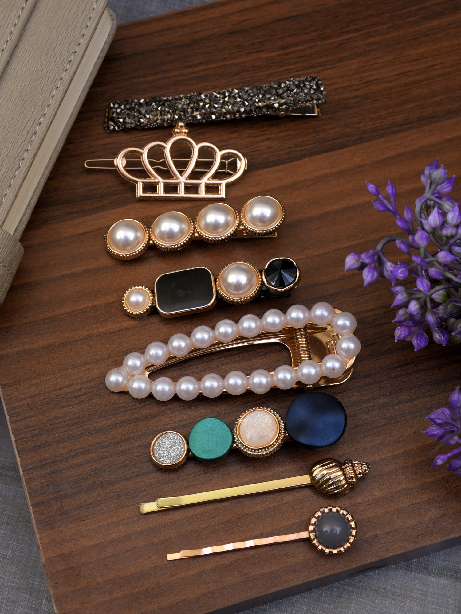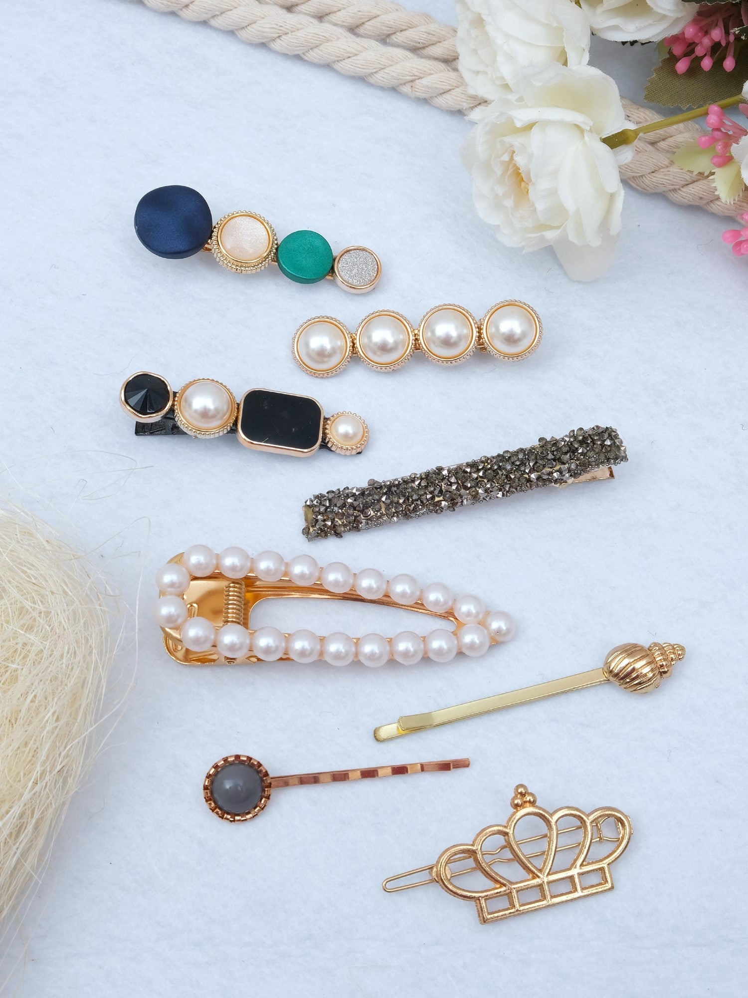 Multicolored Pearls & Gemstone Hair Clip set Girls- Pack of 8