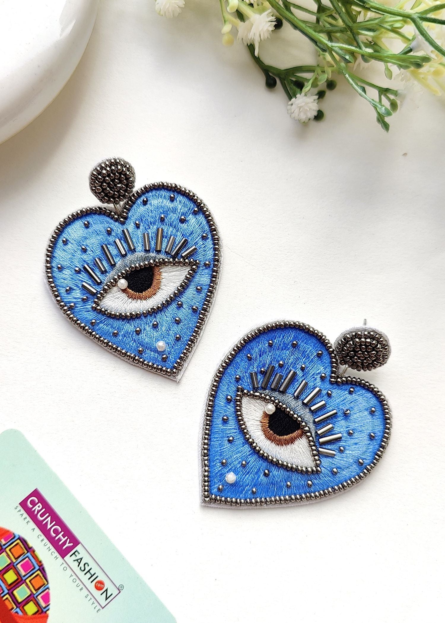 - Sky-Blue Love Gaze: Handmade Evil Eye Heart Earrings