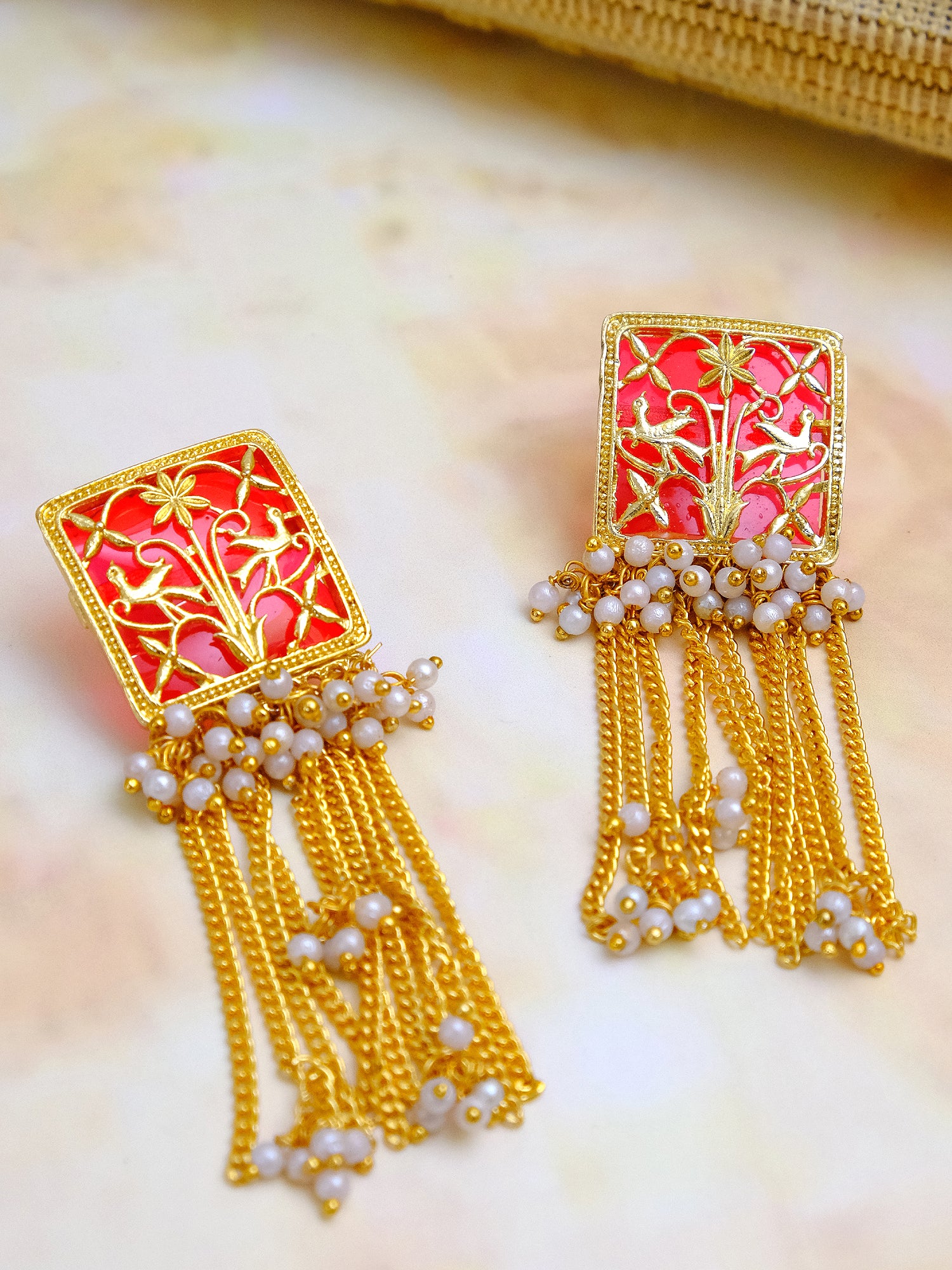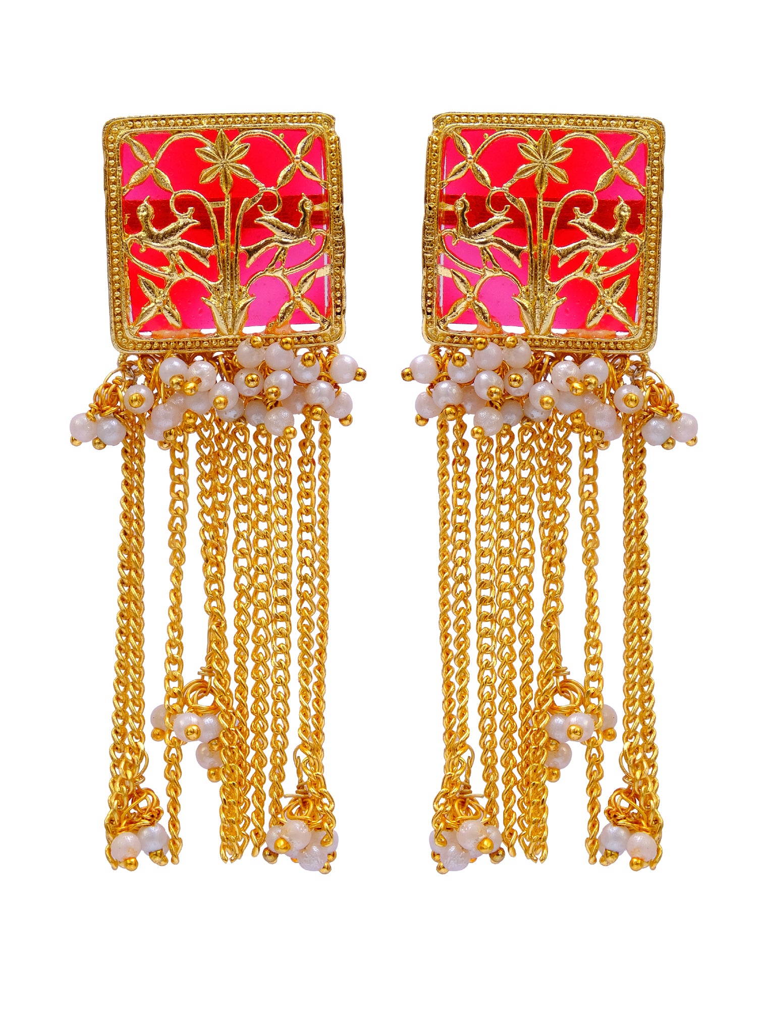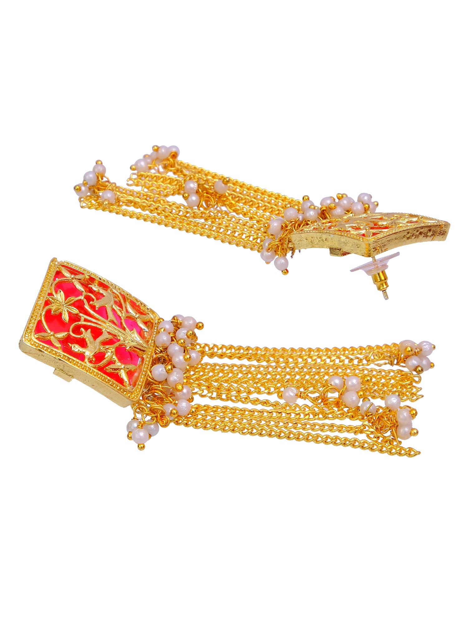 Traditional Dangler Red Chain Earrings with White Pearls for Pink Saree