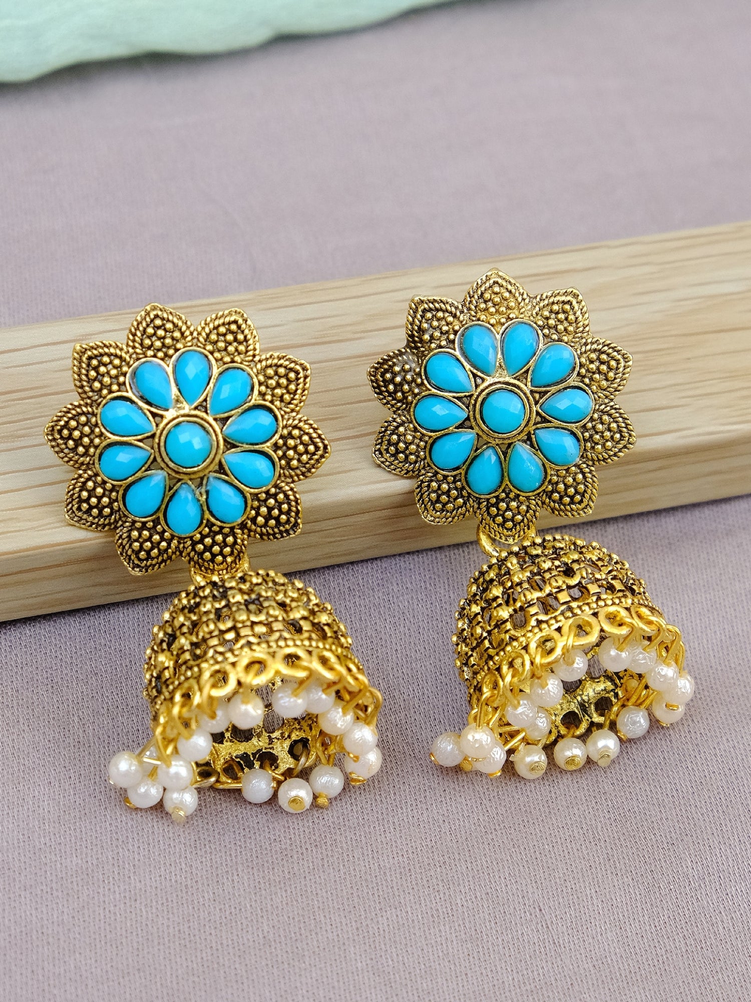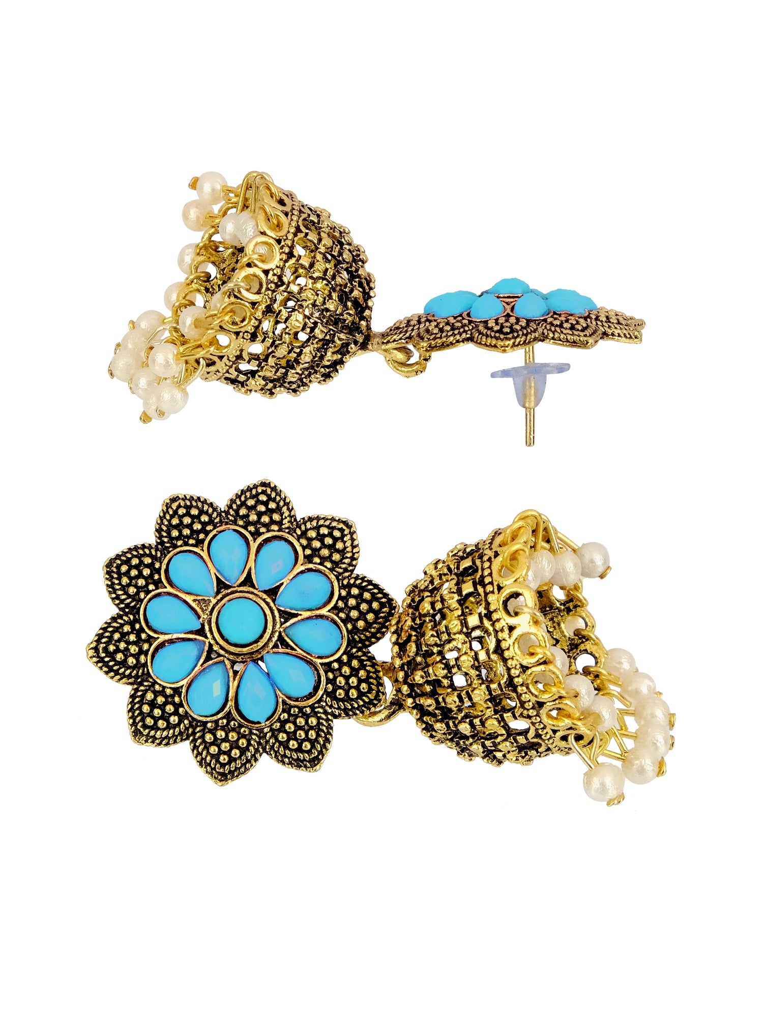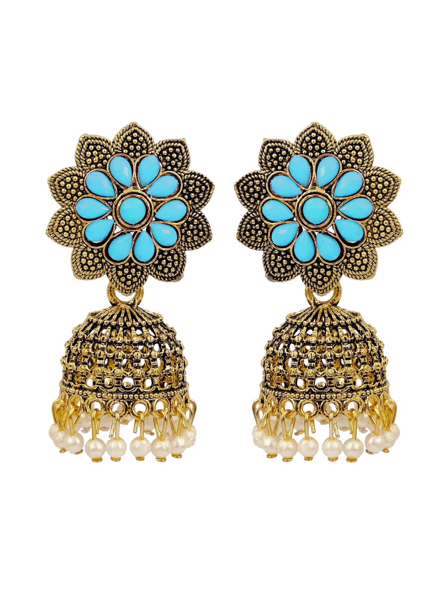 Traditional Gold Plated Blue Kundan Jhumka Earrings for Women with Pearls