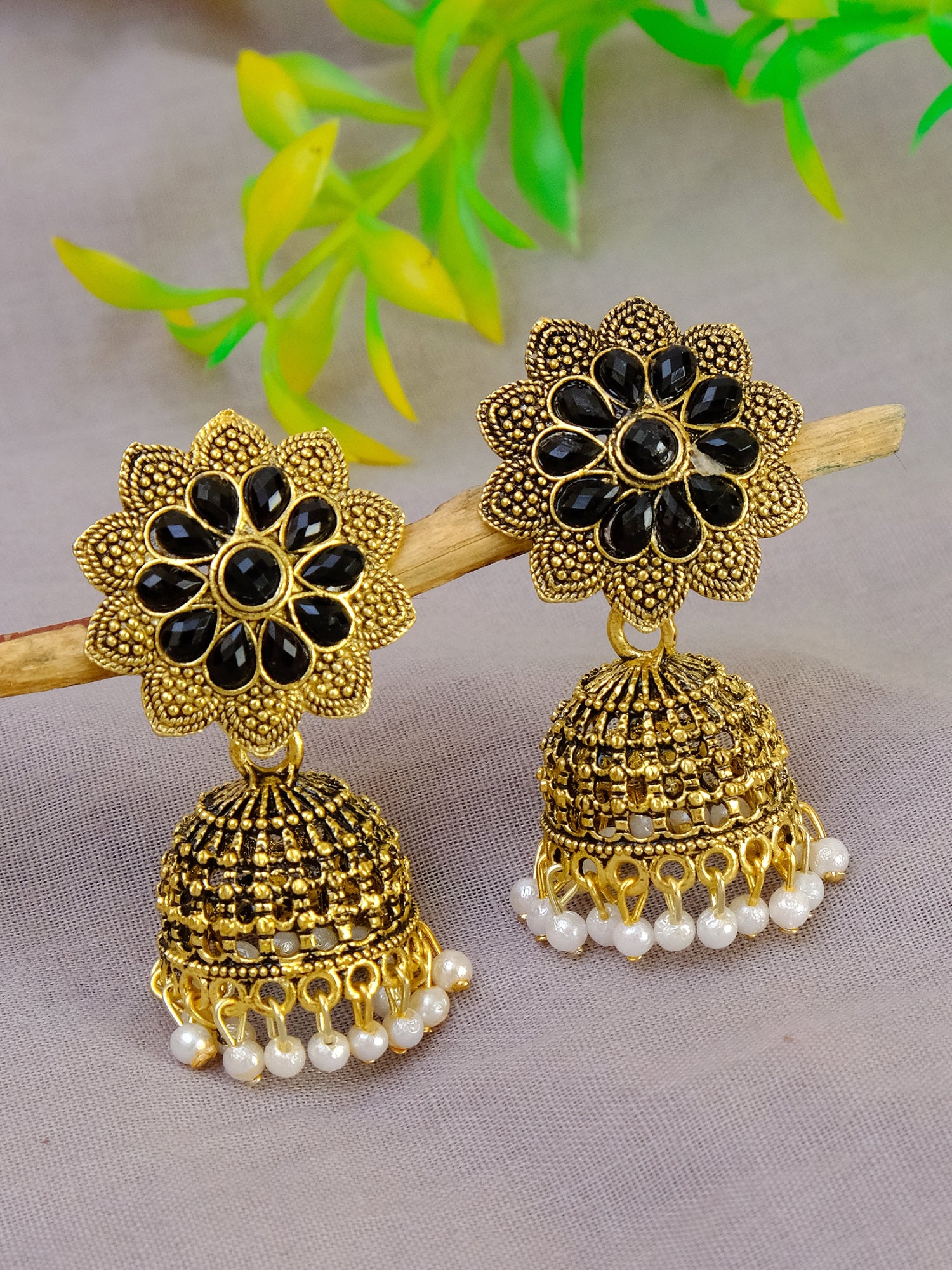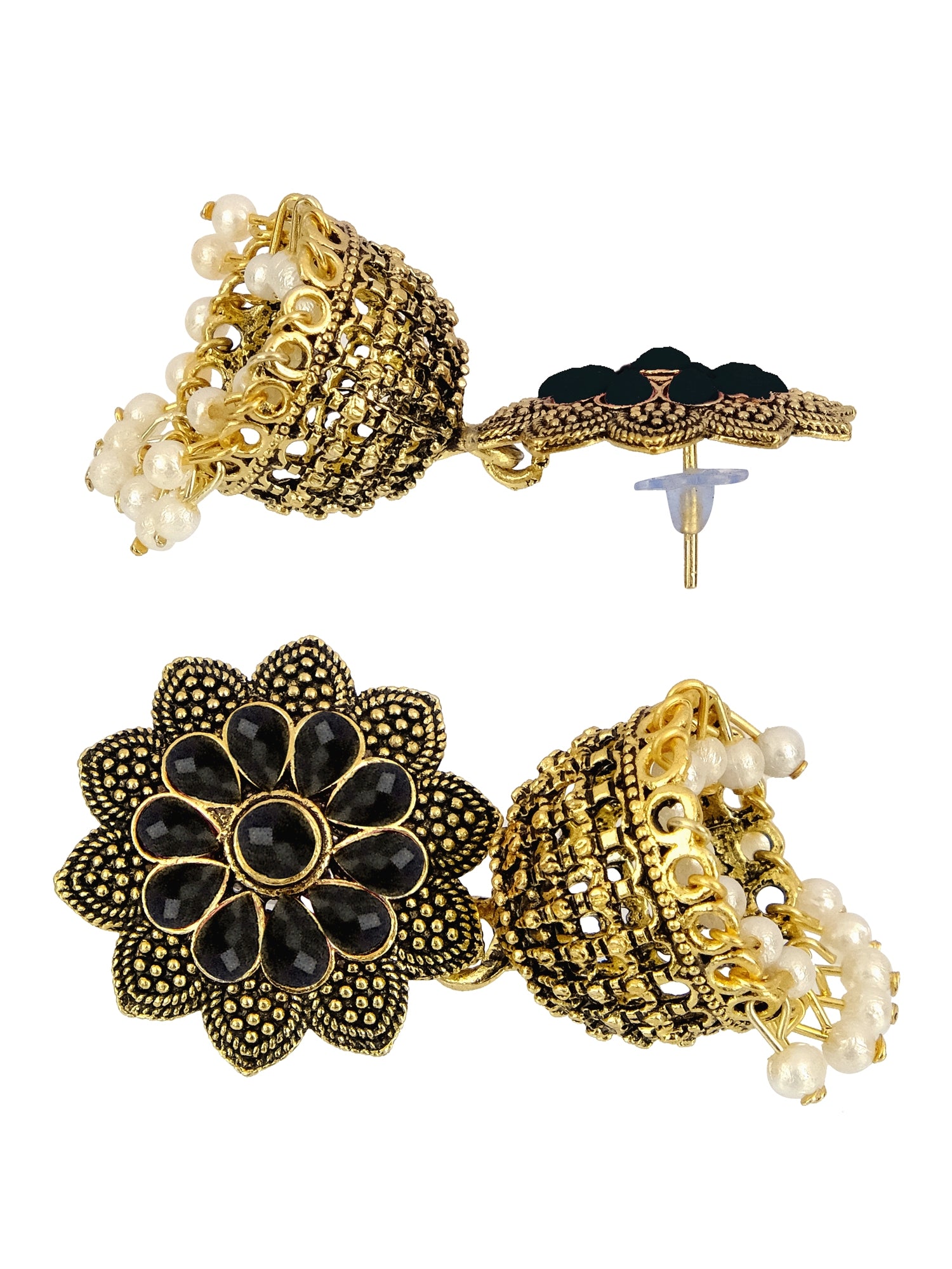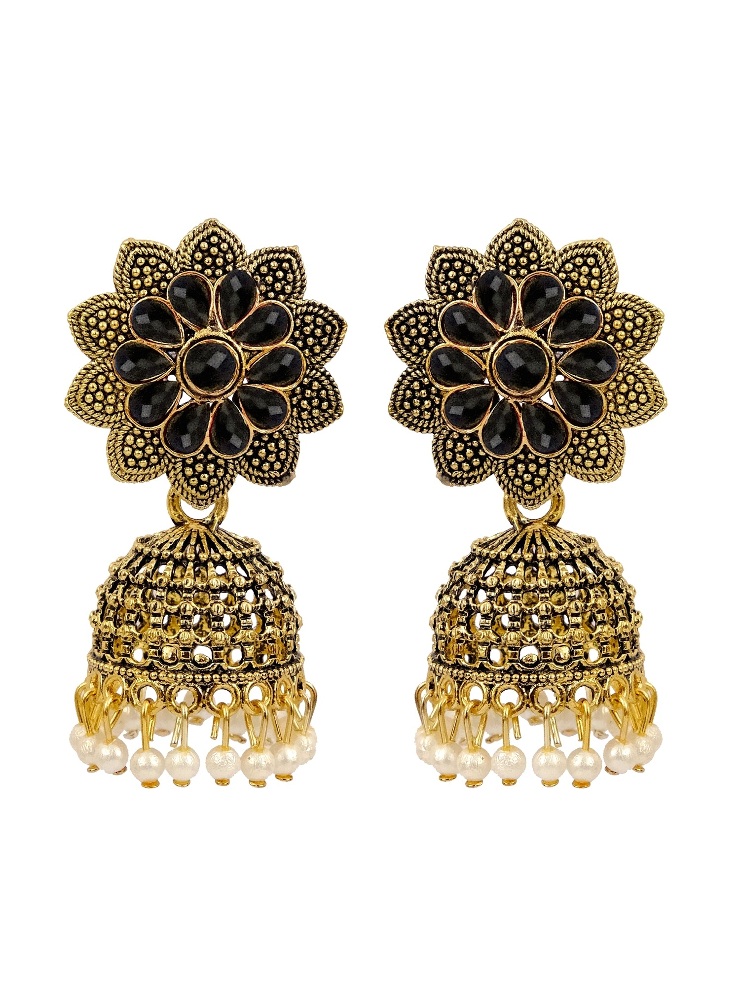 - Traditional Oxidised Gold Plated Floral Black Jhumka Earrings with Pearls