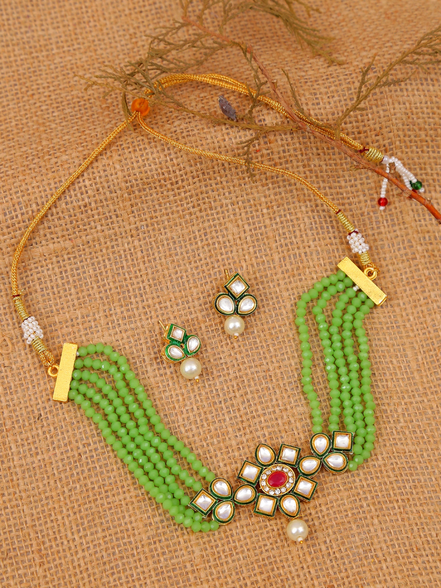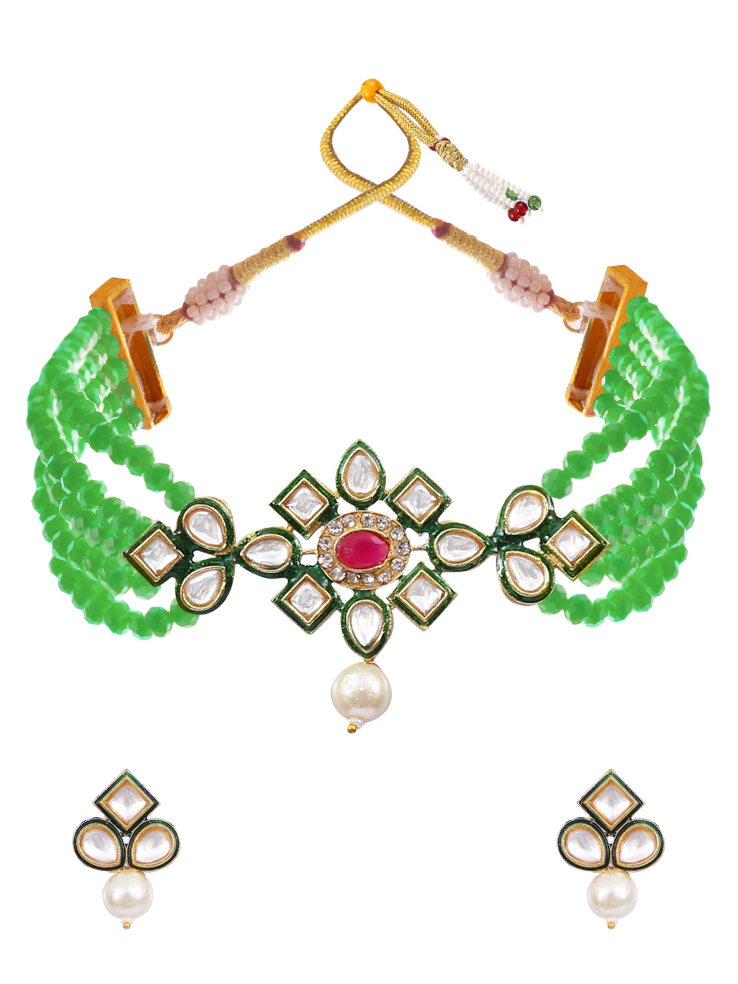 - Traditional Gold Plated Royal Green Pearl & Kundan Choker Necklace & Earring Set RAS0407