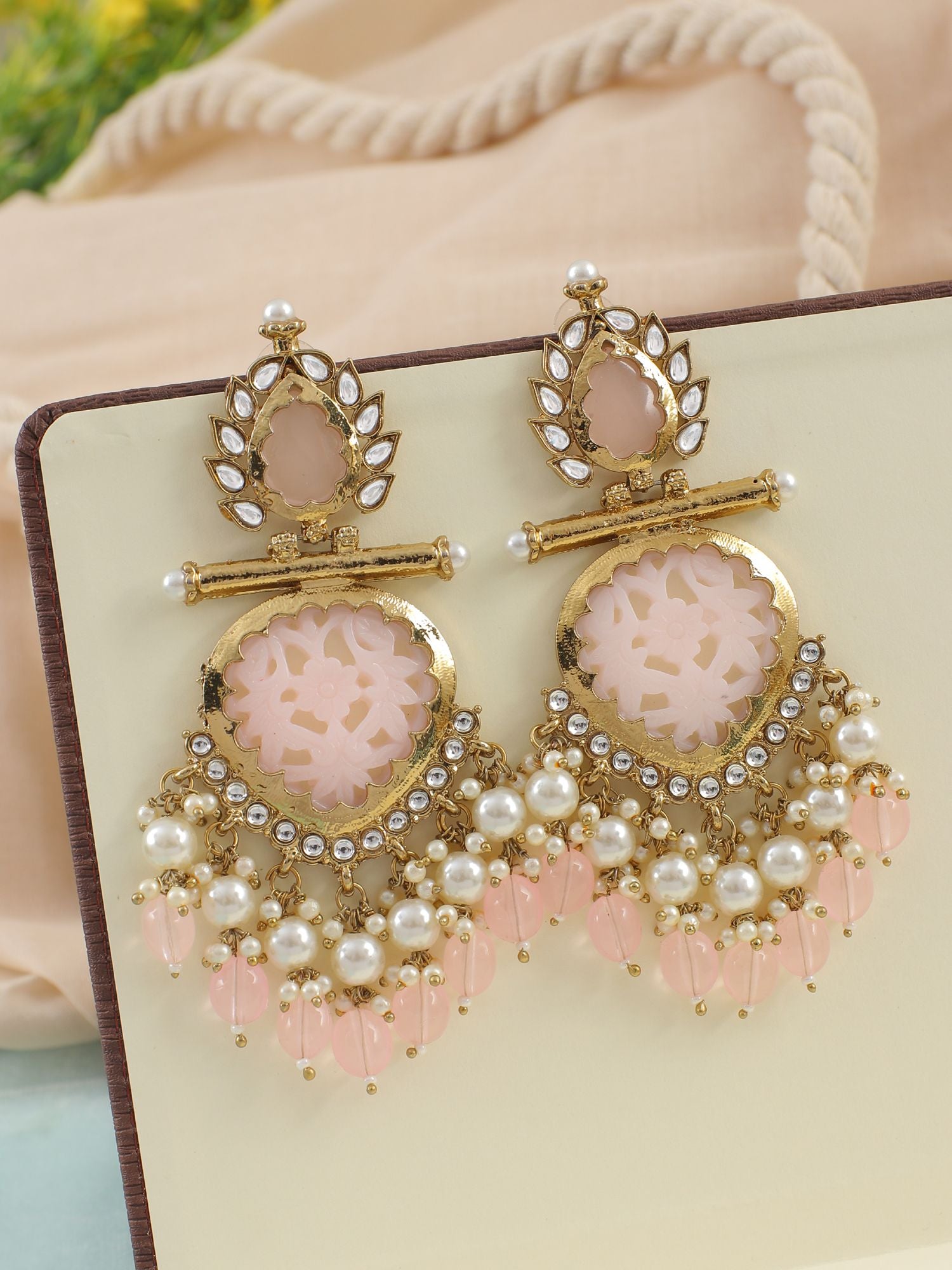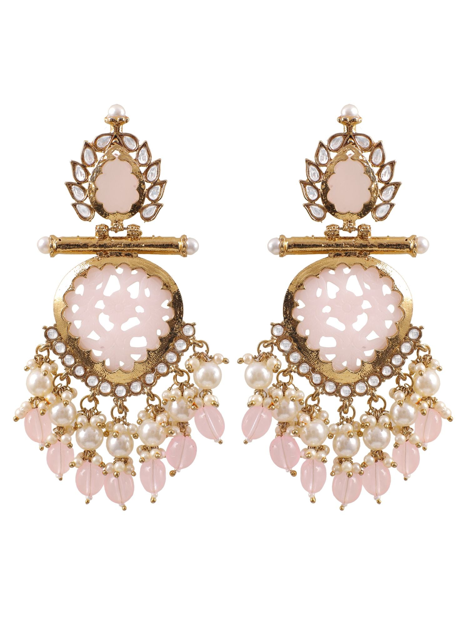 - Gold Plated Light Pink Kundan Chandbali Earrings with Pearls