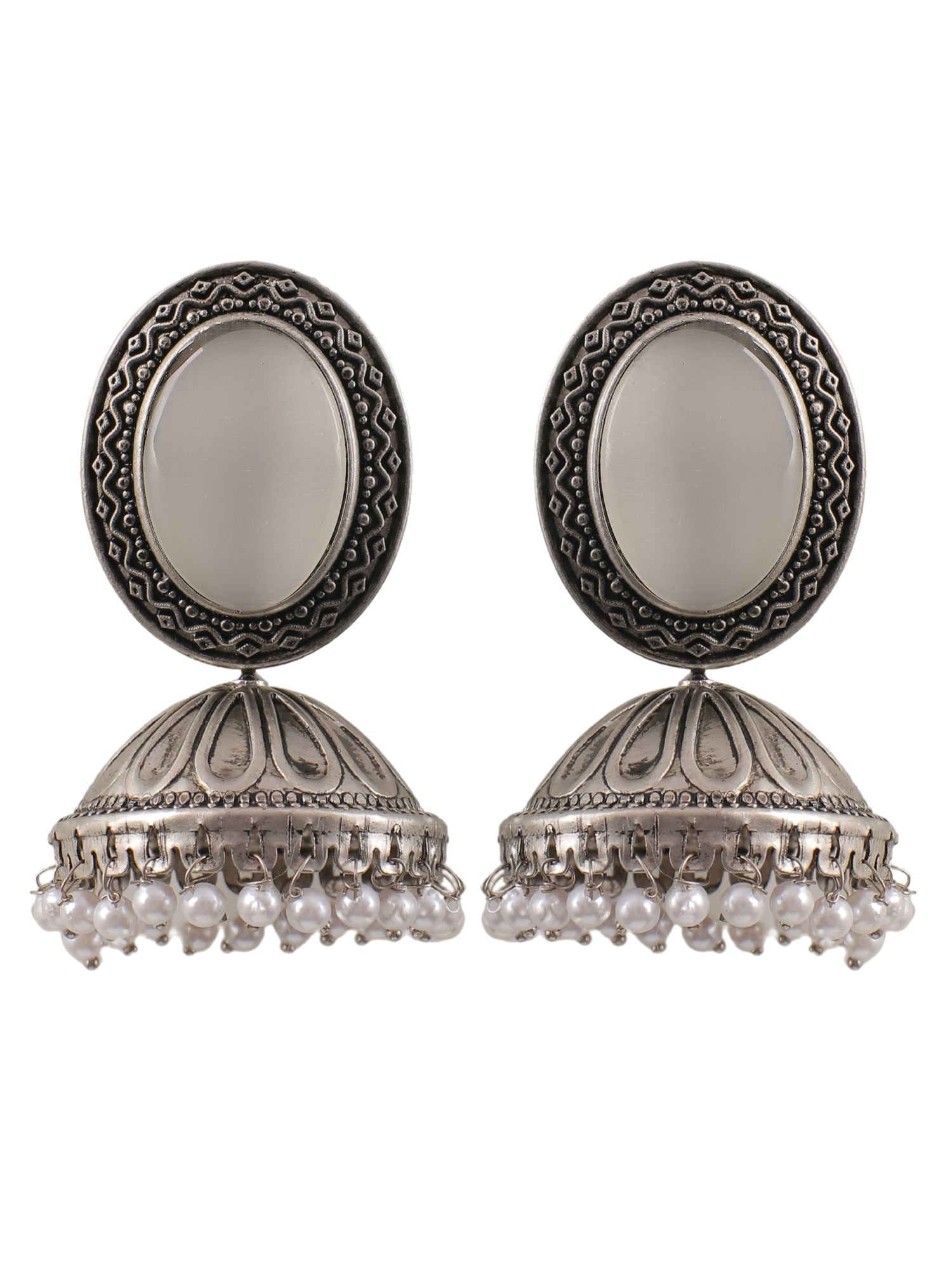 Chic Oxidised Silver Jhumkas with White Crystal Beads for Fashionistas