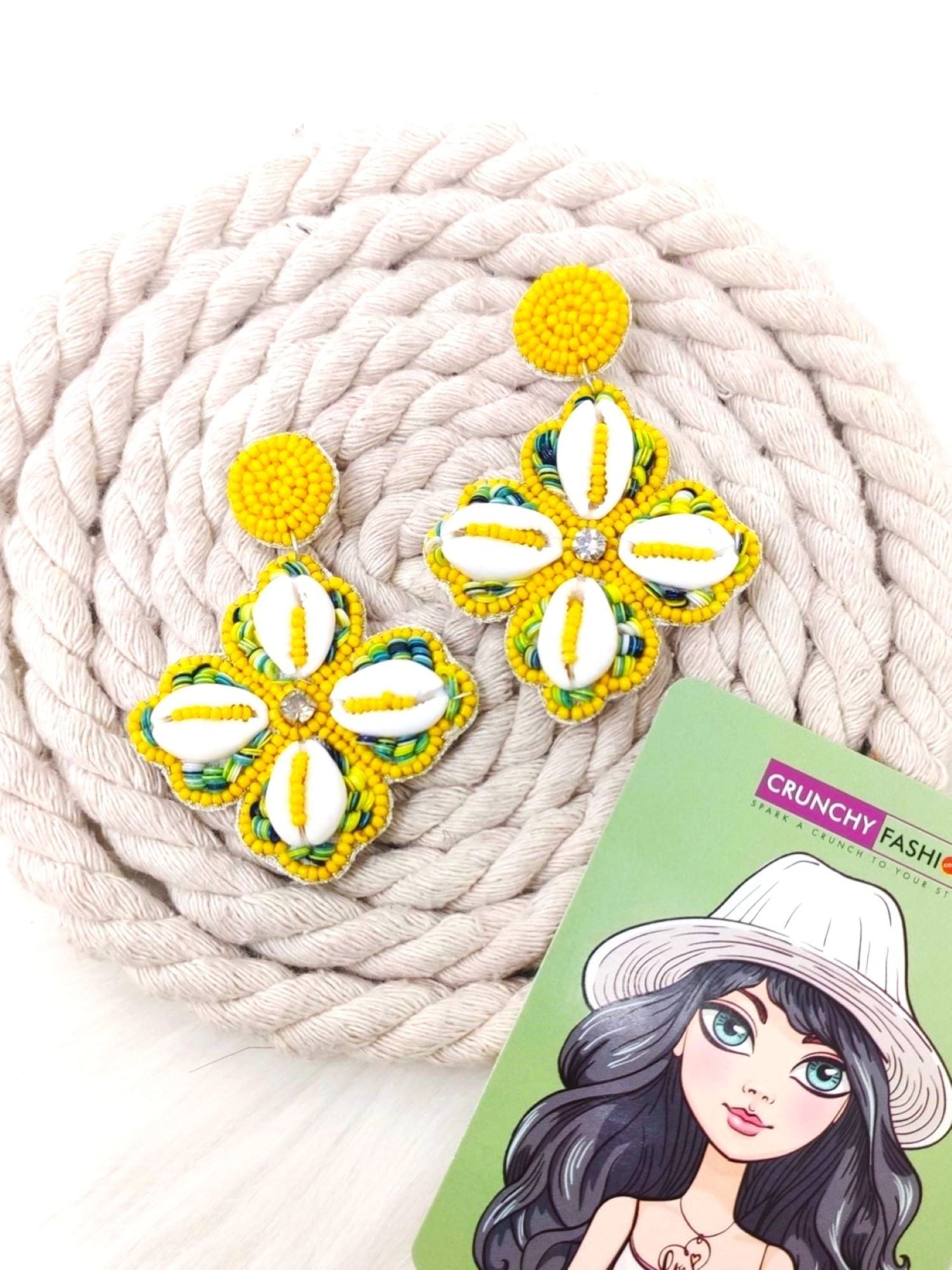 Floral Fantasy - Yellow-Green Cowrie Shell & Beadwork Earrings