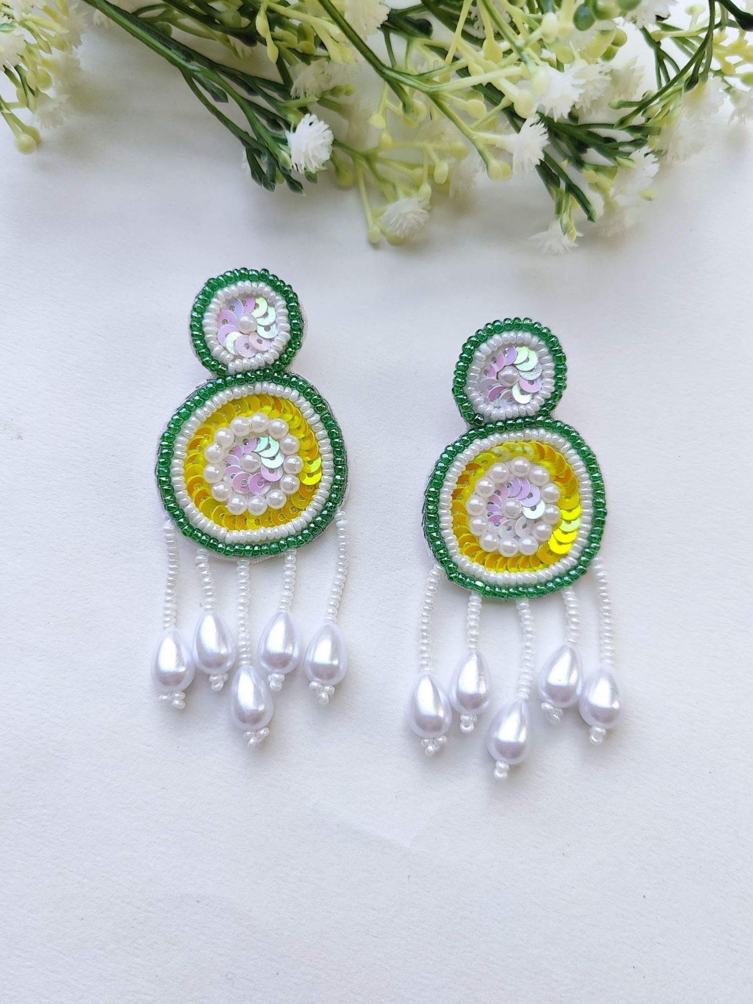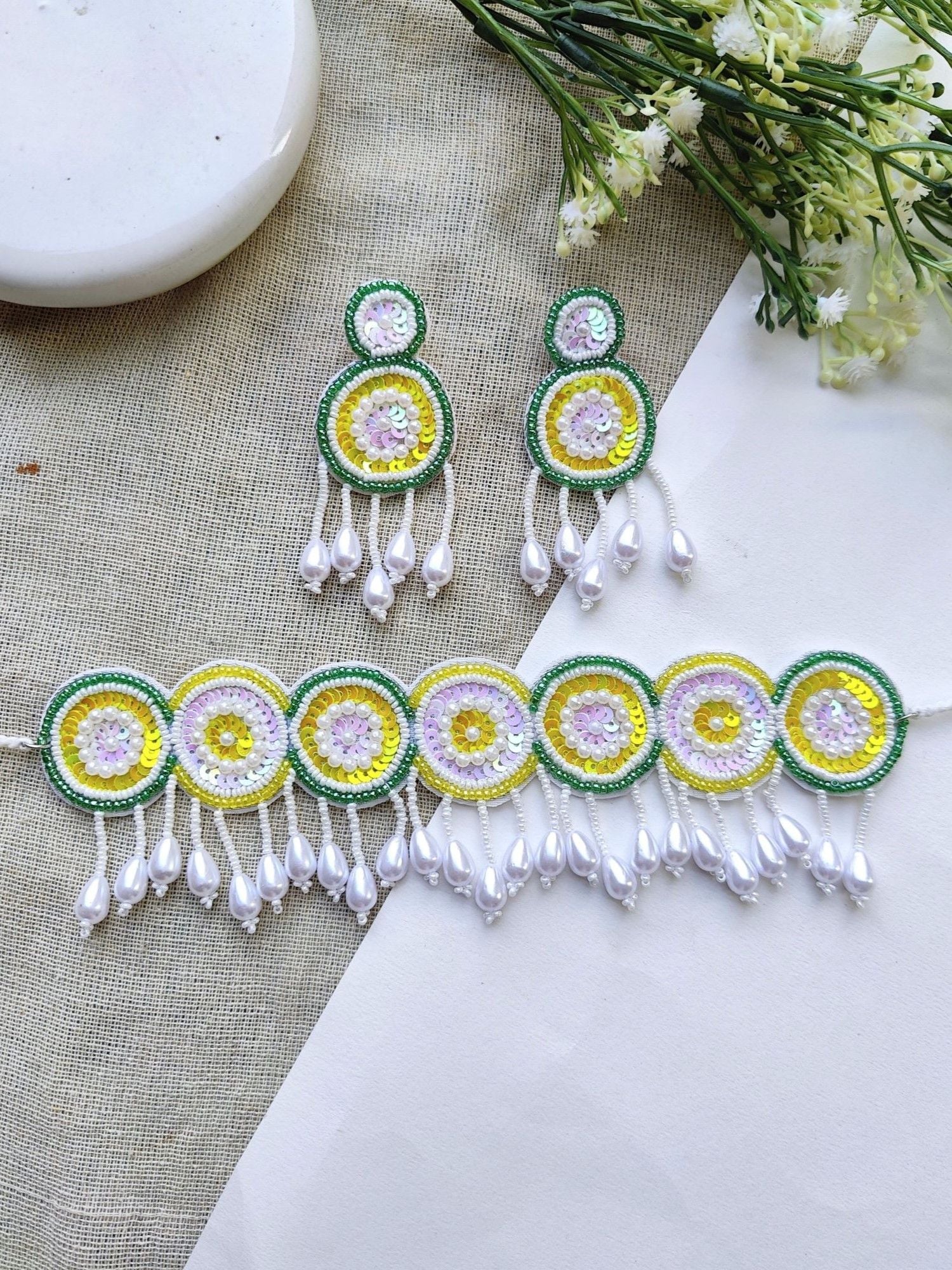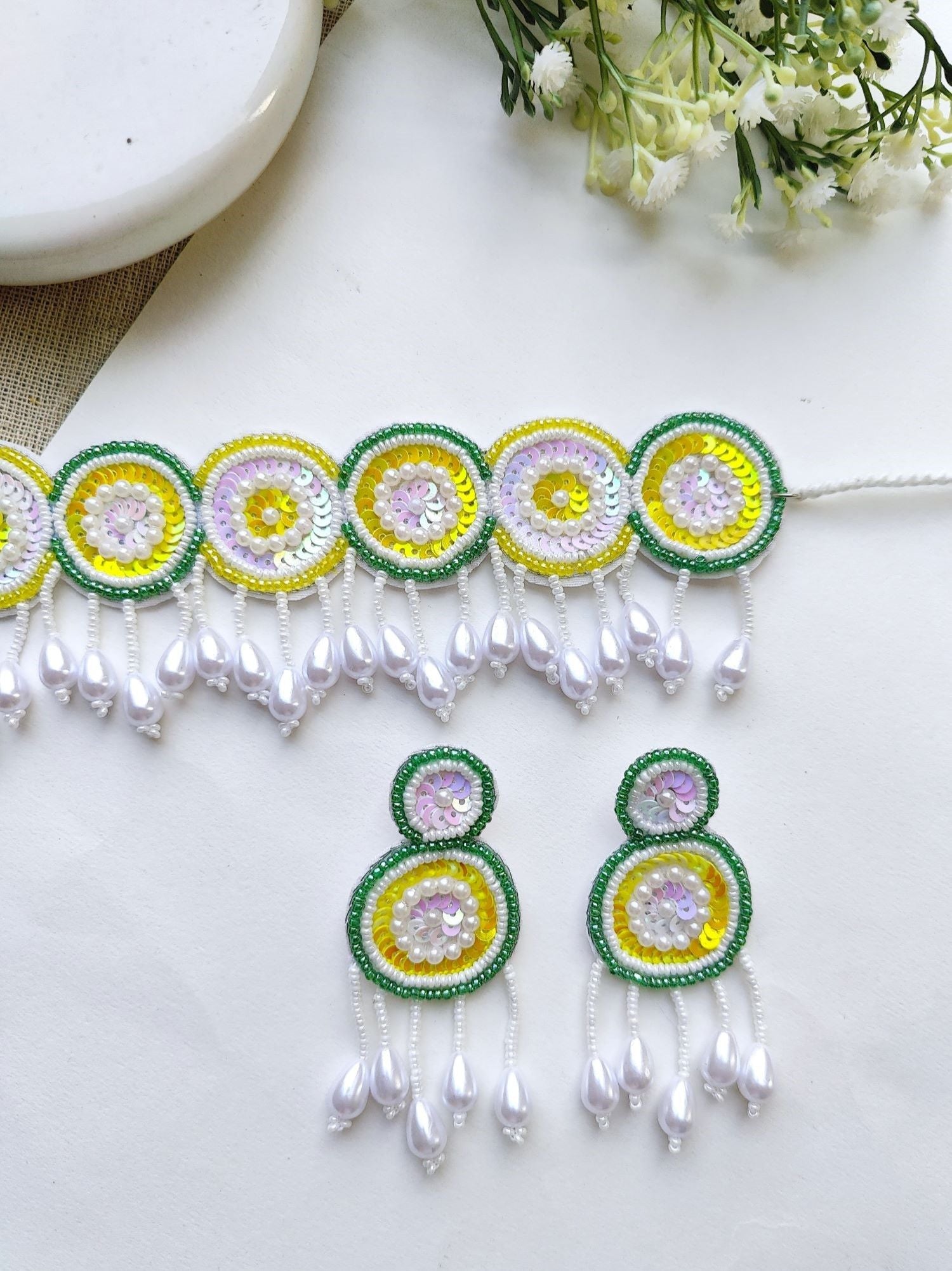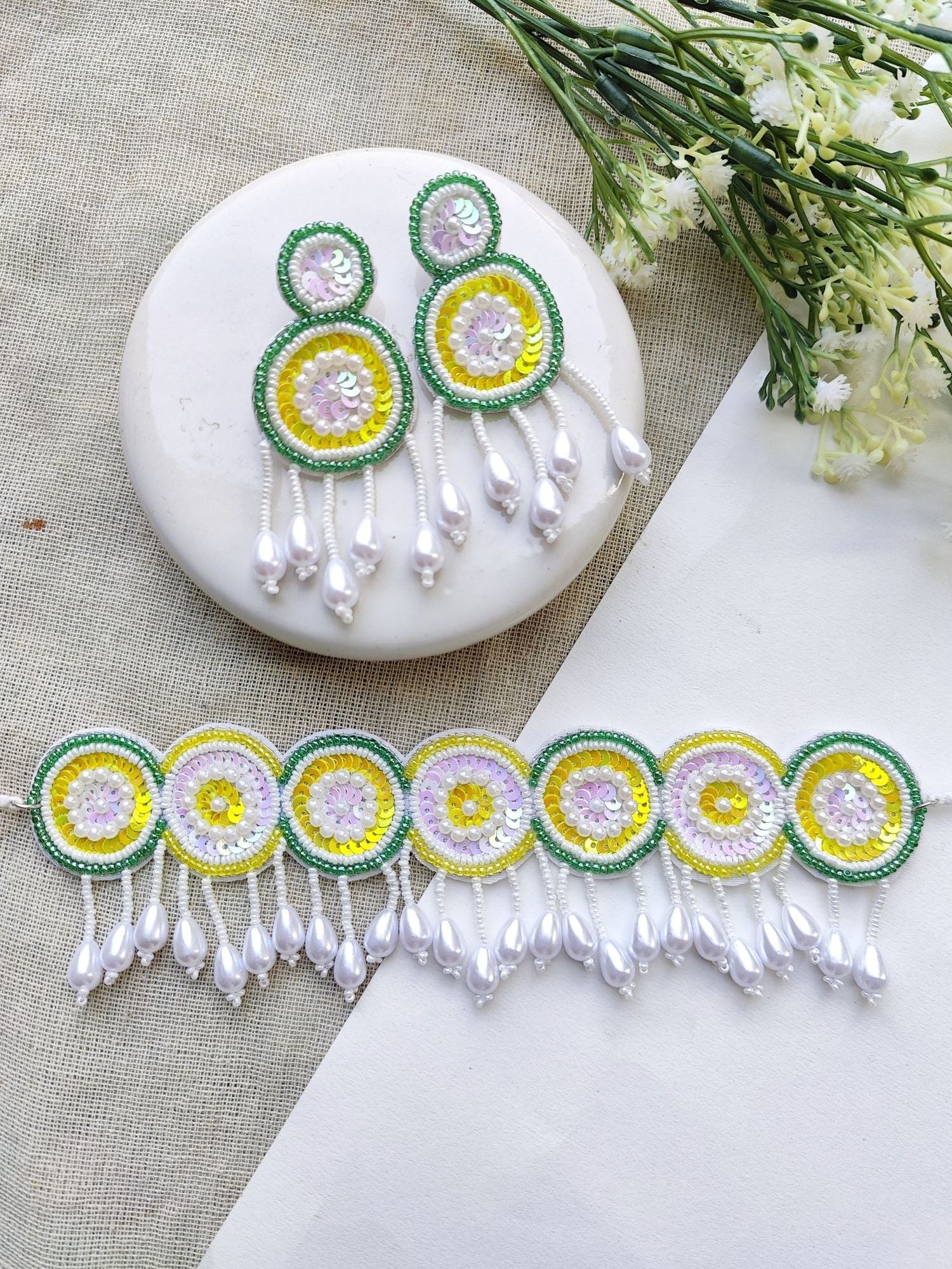 Ethereal Radiance: Yellow-Green Beaded Handmade Choker Jewelry Set - Perfect for Haldi-Mehndi Celebrations