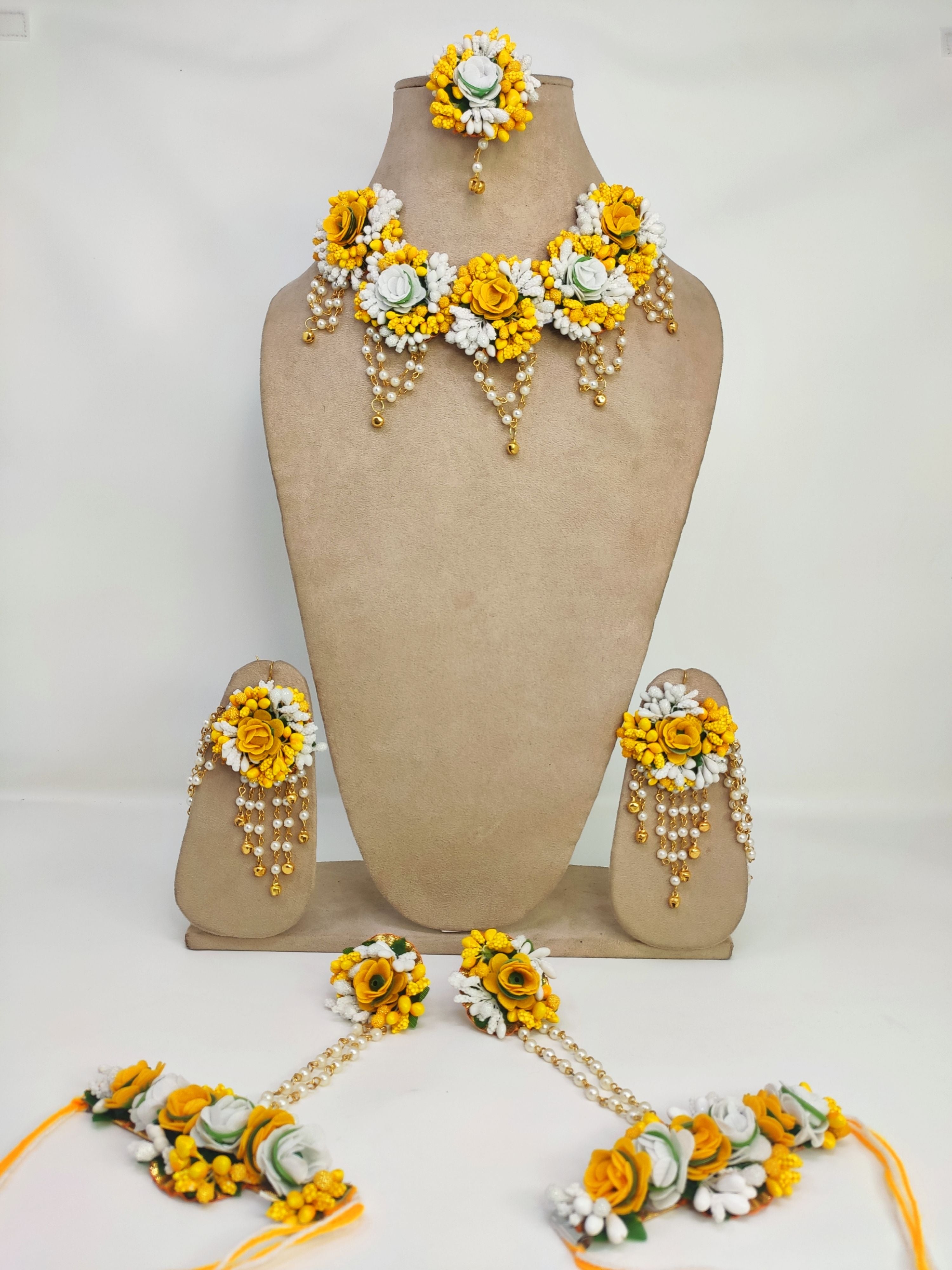 Yellow & White Floral Haldi-Mehndi Jewellery Set for Women with Multilayer Earrings
